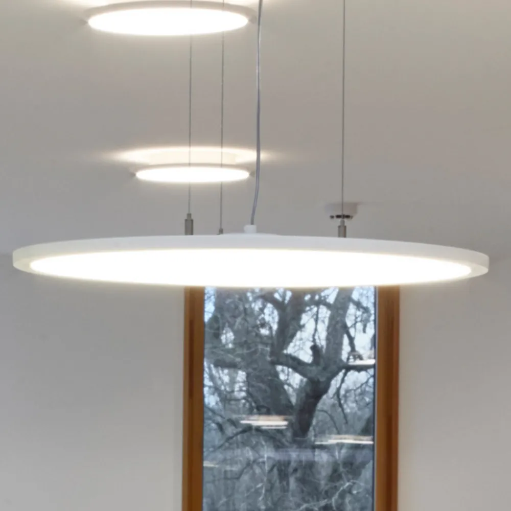 Med FL Round 777 PL OP LED hengende armatur kan stor, behagelig generell belysning oppnås i moderne kontor- og forretningslokaler. Den flate, runde formen og hvite, ripebestandige pulverbelegget til det støpte aluminiumshuset har et nøytralt utseende. Sidelysmatingen (LED-sidelysteknologi), den sterkt transmitterende lyslederen og det opale plastdekselet sørger for det karakteristiske, homogene og brede lysutbyttet.