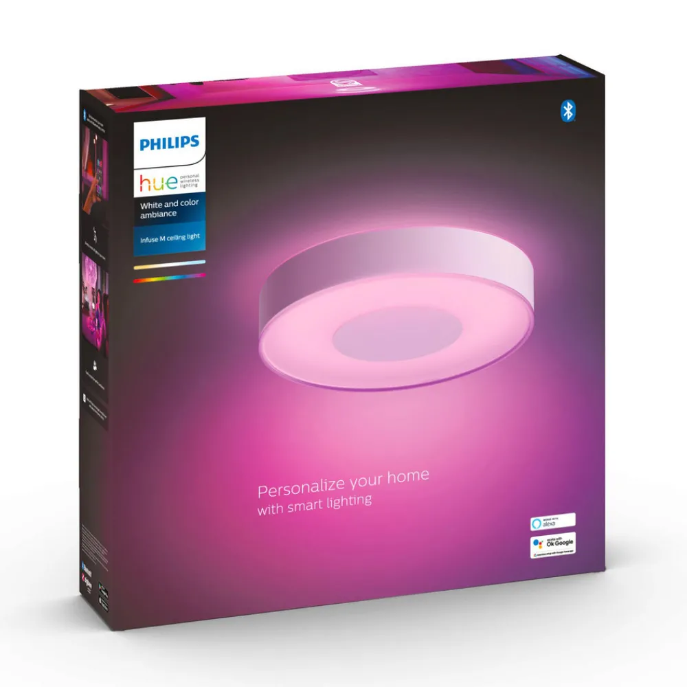 Den moderne og elegante Infuse LED-taklampe gir omfattende rombelysning med direkte lys og takbelysning. Den er utformet i en rund form, med en omsluttende ramme på siden og et sentralt panel på undersiden. I tillegg til et hvitt lys i forskjellige fargetemperaturer, som varmhvitt eller dagslys , tilbyr lampen også farget lys, slik at en lang rekke lysscenarier er mulig; lysstyrken kan også justeres når som helst. Lyset styres enten direkte via Bluetooth med smarttelefon/nettbrett eller integrert i et smarthjemsystem som Philips Hue via en ZigBee -bro.