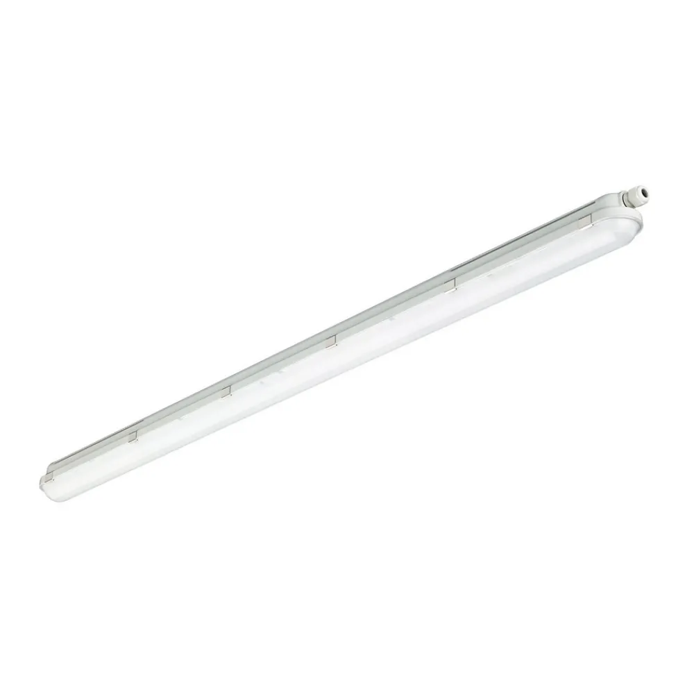 Våtromsdiffusorarmatur WT120C, DALI-dimbar, lengde 151,5 cm WTC120C er en funksjonell diffusorarmatur fra Philips CoreLine Waterproof G2 LSC-serien, som er et energibesparende alternativ til konvensjonelle armaturer med lysrør. Takket være den strålesikre og slagfaste polykarbonatkonstruksjonen kan den brukes i en rekke ulike miljøer, for eksempel vaskerom, kjellere, lagerrom, parkeringsplasser og verksteder. Leveringsomfanget inkluderer braketter for utenpåliggende montering og kroker for nedpendlet montering – Inklusive forkoblingsutstyr (PSD, DALI-dimbar) – Utstrålingsvinkel: 105° – Omgivelsestemperatur under drift: – 20 °C til + 35 °C – Kapslingsklasse: IP65 – Slagfasthet: IK08 – 5-polet hurtigkontakt – Skrubar kabelinnføring