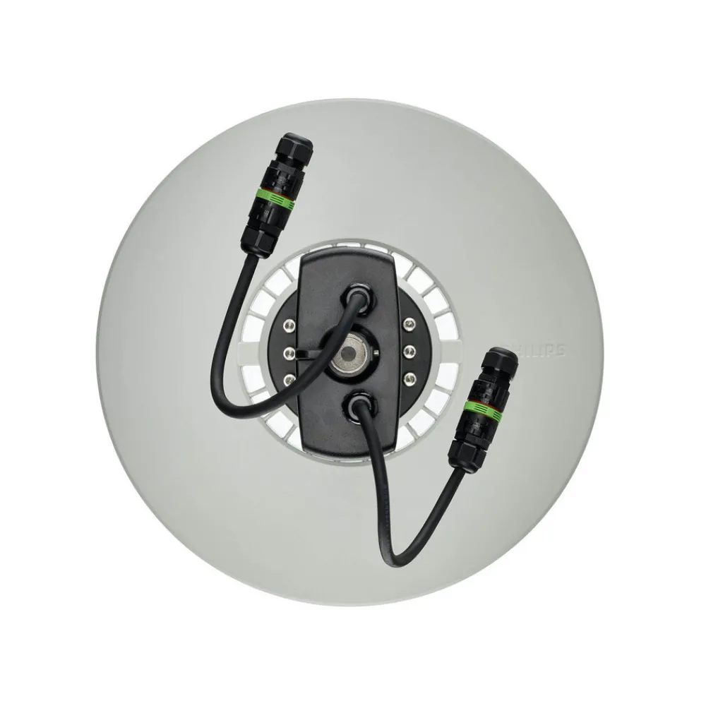 Høytytende BY120P LED high bay-spotlight, DALI, smalstrålende (55°) BY120P LED high bay-spotlight fra Philips CoreLine HighBay-serien gir effektiv belysning av produksjons- og lagerhaller med enestående energieffektivitet, som kan økes ytterligere takket være dimmbarheten. Den består av et grått aluminiumshus og en skjerm, og har en forhåndsmontert industriplugg som gjør den enkel å koble til. BY120P er også utstyrt med en krok for ettpunktsoppheng, alternativt kan den monteres utenpåliggende ved hjelp av en brakett (ikke inkludert) – Inkluderer styringsutstyr (PSD, DALI-dimbar) – Utstrålingsvinkel: 55° – Omgivelsestemperatur under drift: – 30 °C til + 45 °C – Kapslingsgrad: IP65 – Slagfasthet: IK07 – Tilkoblingskabel (0,3 m) med 3-polet pluggkontakt – Oppfyller IFS/HACCP-kravene for næringsmiddelindustrien