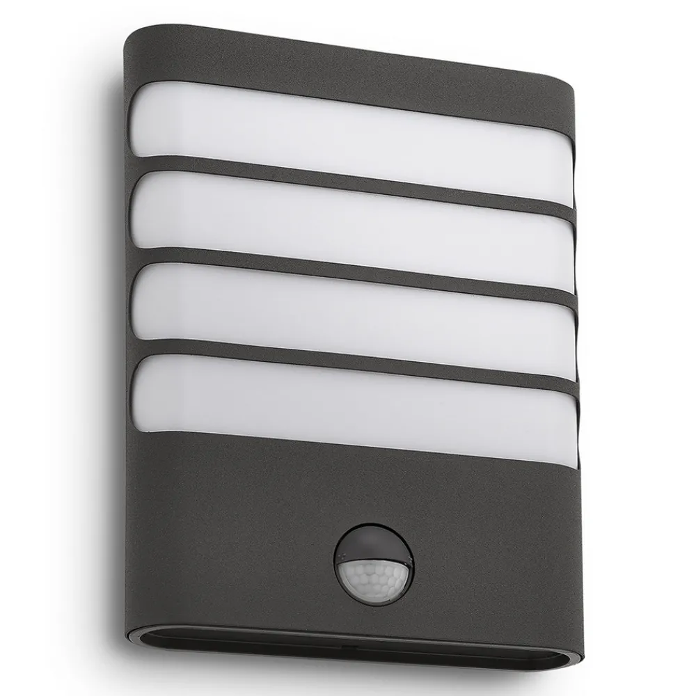 Det antrasittfargede lyset gir praktisk hjelp med den integrerte bevegeslessensoren. Så snart man kommer nær den gir den automatisk nok lys og sikkerhet, og derfor er LED-lyset spesielt praktisk i inngangspartiet. Slik finner du husnøkkelen raskt. Den er værbestandig med kapslingsgrad IP44. Utevegglyset har en enkel deising og passer derfor godt i omgivelsene. Lampeskjermen er oppdelt med tverrstriper og tar seg svært godt ut. Behagelig belysning med integrert 3W LED-pære.