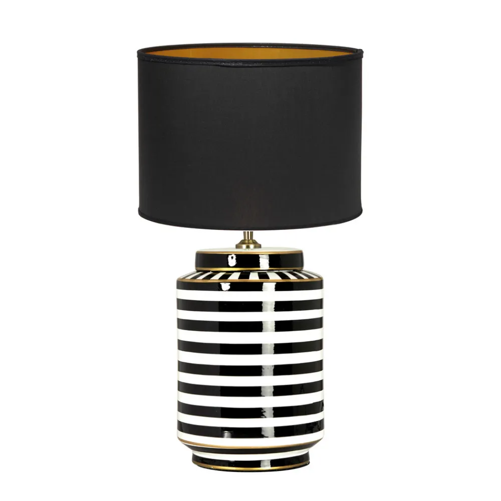 Gatsby bordlampe i tekstil med keramisk fot i svart og hvitt Den elegante Gatsby bordlampen består av en svart og hvit keramisk fot med detaljer i brent messing og en svart, sylindrisk skjerm i polyestertekstil med gylden innside.