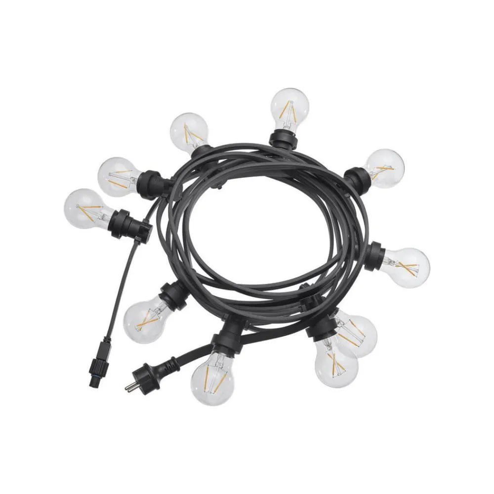 Robust Bright utendørs lyskjede med klare lyskilder Den populære Bright utendørs lyskjeden er et startsett med mulighet for utvidelse. Lyskjeden leveres med ti E27 LED-lyskilder. Den har en 230V-kontakt i den ene enden og en stikkontakt i den andre enden for tilkobling av flere lyskilder om ønskelig. Denne startlyskjeden er totalt 7,2 meter lang, og det er 2,5 meter fra støpselet til den første lampeuttaket. Det kan kobles til maksimalt 9 forlengelseslyskjeder med 10 lampeuttak hver. På denne måten kan det opprettes et tilkoblingssystem med maksimalt 100 lyskilder. Maksimal belastning på hver lampefatning er 15 W. Avhengig av valg av lyskilde kan utseendet på den enkle, svarte kjeden påvirkes.