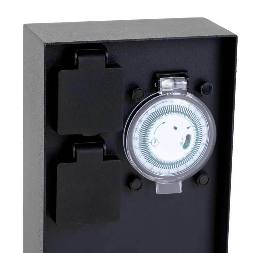 Svart stikkontaktsøyle Foranda med timer og 2 stikkontakter, for utendørs bruk, rustfritt stål Foranda er egnet for utendørs bruk med IP44, og de to stikkontaktene er godt beskyttet av klaffer når de ikke er i bruk. Den integrerte timeren kan slås på etter behov for å betjene stikkontaktene på bestemte tidspunkter. Dette er spesielt nyttig når det gjelder dekorativ belysning for gårdsplassen og hagen, som bare skal lyse opp etter mørkets frembrudd. Ved hjelp av timeren slår lyskildene seg automatisk på til et bestemt tidspunkt hver kveld og slår seg av igjen senere. Julebelysning er et populært eksempel på et bruksområde her for å lyse opp den mørke årstiden med dekorative lyspunkter uten store anstrengelser. Naturligvis kan strømsøylen med de to energikildene også brukes til andre formål – 2 x CEE 7/3 (maks. 16A/maks. 3600 W)