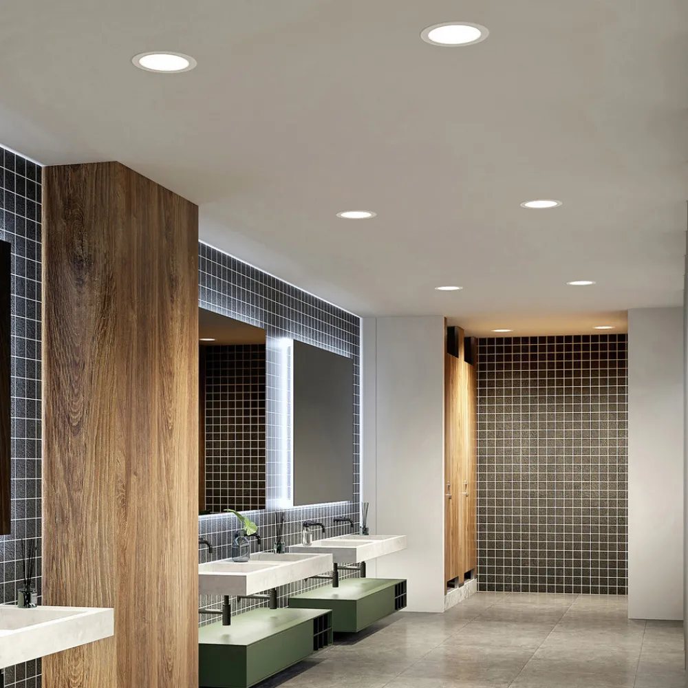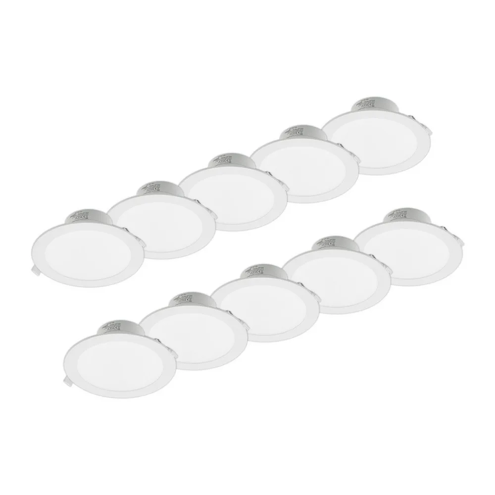 Stor LED-downlight Rida med rund, hvit omramming, lysfarge kan styres via DIP-bryter, IP44, sett med 10 stk Rida er en praktisk lyskilde med forholdsvis store dimensjoner for en innfellingslampe, som kan brukes på mange forskjellige måter både privat og i næringslivet. Den høye kapslingsgraden gjør at den også kan brukes i fuktige rom, da fuktighet ikke kan skade den innfelte spotten, noe som gjør den egnet til belysning av bad. Den enkle designen med hvit overflate og rund form passer inn i mange moderne miljøer, men er i utgangspunktet også ganske tidløs. Du kan derfor bruke LED-downlight hvor du vil. Lysstyrken til LED-lampene kan også reguleres ved behov, og en ekstern dimmer er tilgjengelig. Muligheten til å variere lysfargen via en DIP-bryter er spesielt interessant, også for kommersiell bruk. Dette gjør det mulig å velge og stille inn riktig lysfarge før installasjon. En relativt bred lysvinkel muliggjør bred rombelysning, slik at flere innfelte spotlights kan brukes i større rom for å gi en lyssterk, bred belysning – CCT-farge kan stilles inn via DIP-bryter før montering av armaturen – IP44, høy kapslingsgrad for bruk i fuktige rom – dimbar – bred lysvinkel for bred belysning – leveres i et praktisk sett med 10 stk