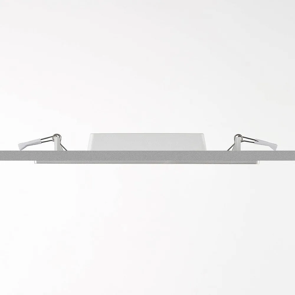 Helina kvadratisk LED-inbyggingslampe med sølvramme, for baderom, dimbar og forhåndsinnstillbar lysfarge Helina LED-inbyggingslampe har et enkelt og tidløst utseende og kan brukes på mange forskjellige måter, og armaturen har flere funksjoner. På den ene siden kan den installeres i fuktige rom takket være IP44-klassifiseringen, ettersom den er tilstrekkelig beskyttet mot fuktighet, og på den andre siden er den dimbar hvis man installerer en ekstern dimmer. Det er også mulig å velge riktig lysfarge før installasjonen, ettersom en DIP-bryter er plassert på huset og kan stilles inn i tre ulike posisjoner.
