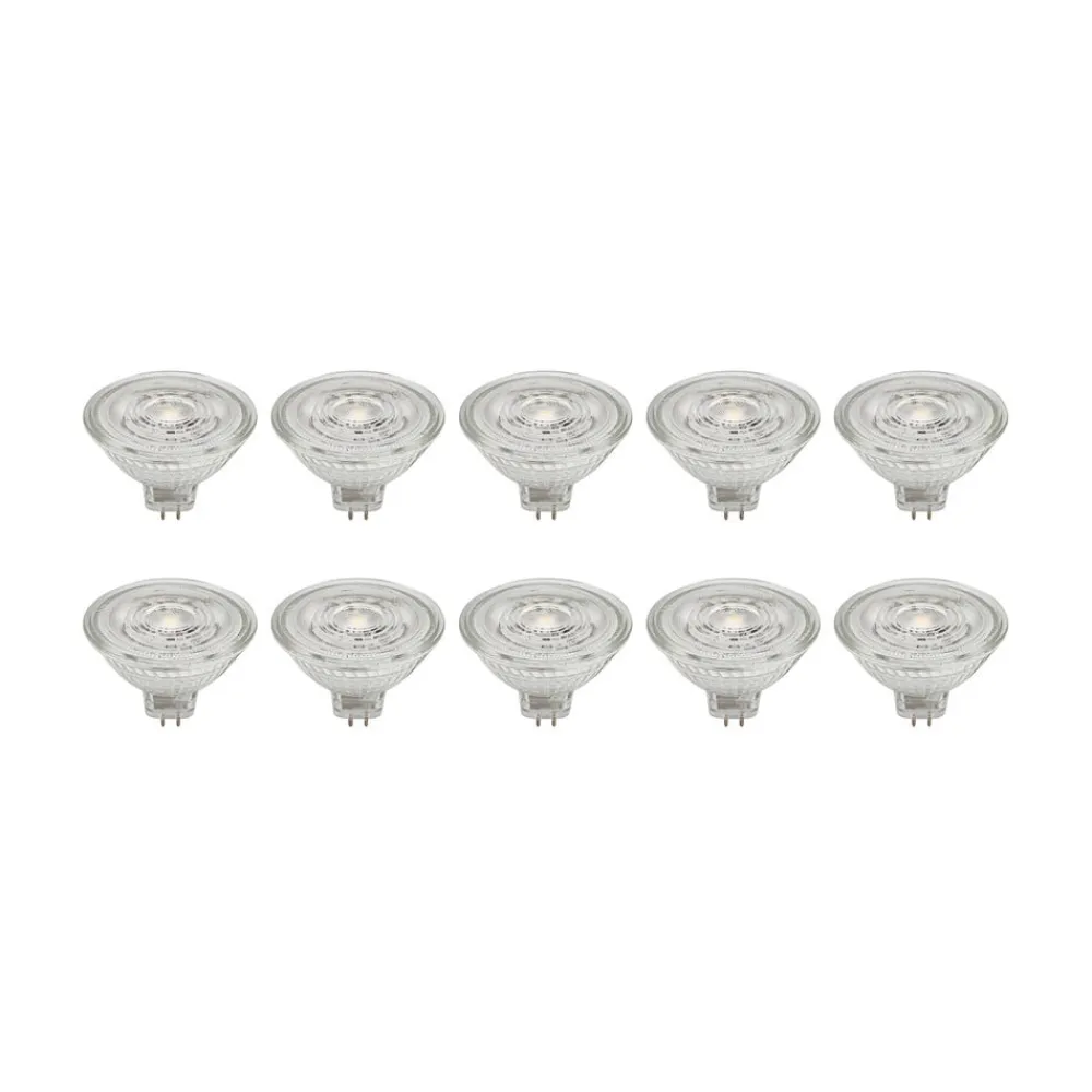 GU5.3 LED-reflektor av glass, transparent i praktisk sett med 10 stk. Denne LED-reflektoren passer til mange lamper med GU5.3-fatning. Den er laget av glass og kan brukes fleksibelt takket være det transparente fargedesignet – ikke dimbar – 4,3 W – 345 lumen – 36° strålevinkel – leveres i et sett med 10 stk