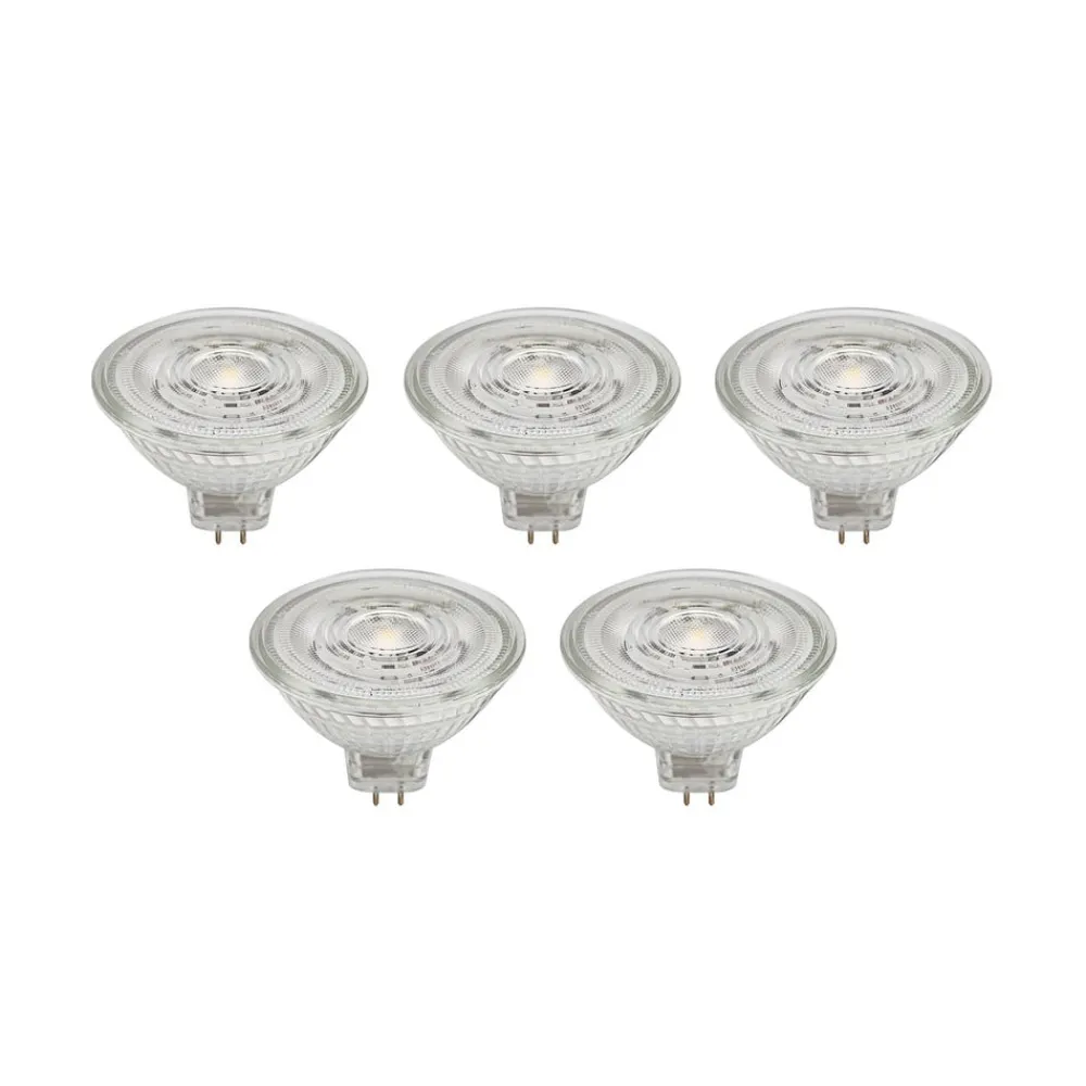 GU5.3 4,9W LED-reflektor i glass, transparent i et praktisk sett med 5 stk. Denne LED-reflektoren passer til mange lamper med GU5.3-sokkel. Den er laget av glass og kan brukes fleksibelt takket være det transparente fargedesignet – ikke dimbar – 4,9 W – 500 lumen – strålevinkel 36° – leveres i et sett med 5 stk