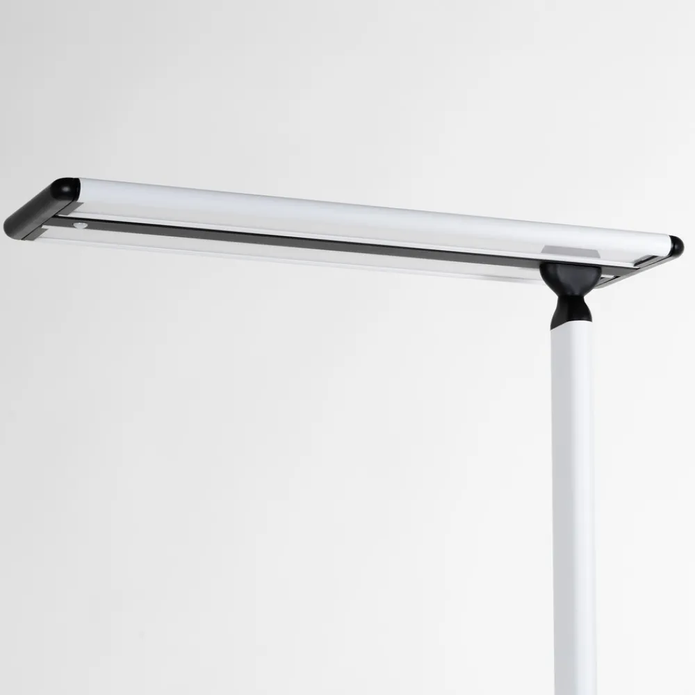 Slim Zyair LED-gulvlampe i hvit med touchdimmer Zyair er den perfekte følgesvenn når det gjelder belysning på arbeidsplassen. Den er laget av aluminium og leveres i en harmonisk hvit farge. Den er utstyrt med fastmonterte LED-lamper som gir en universalhvit belysning, noe som er ideelt for kontoret. Den har også en berøringsdimmer på sokkelen som gjør det enkelt å dimme lyset (direkte og indirekte lys kan dimmes separat), noe som sikrer riktig lysnivå til enhver tid. Zyair LED-gulvlampe kan kombineres med andre lamper i serien for å skape et harmonisk helhetsinntrykk i interiøret – UGR < 19 – IK02 – SDMC: 3 – U-formet fot