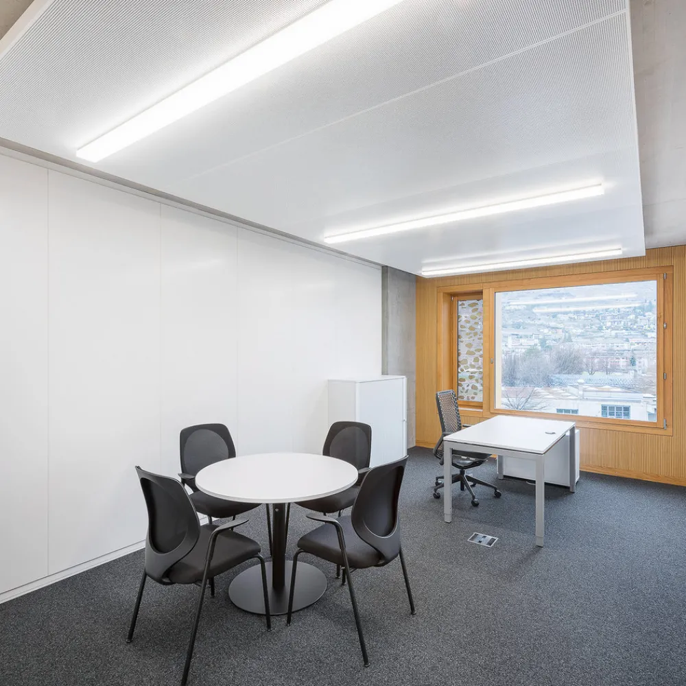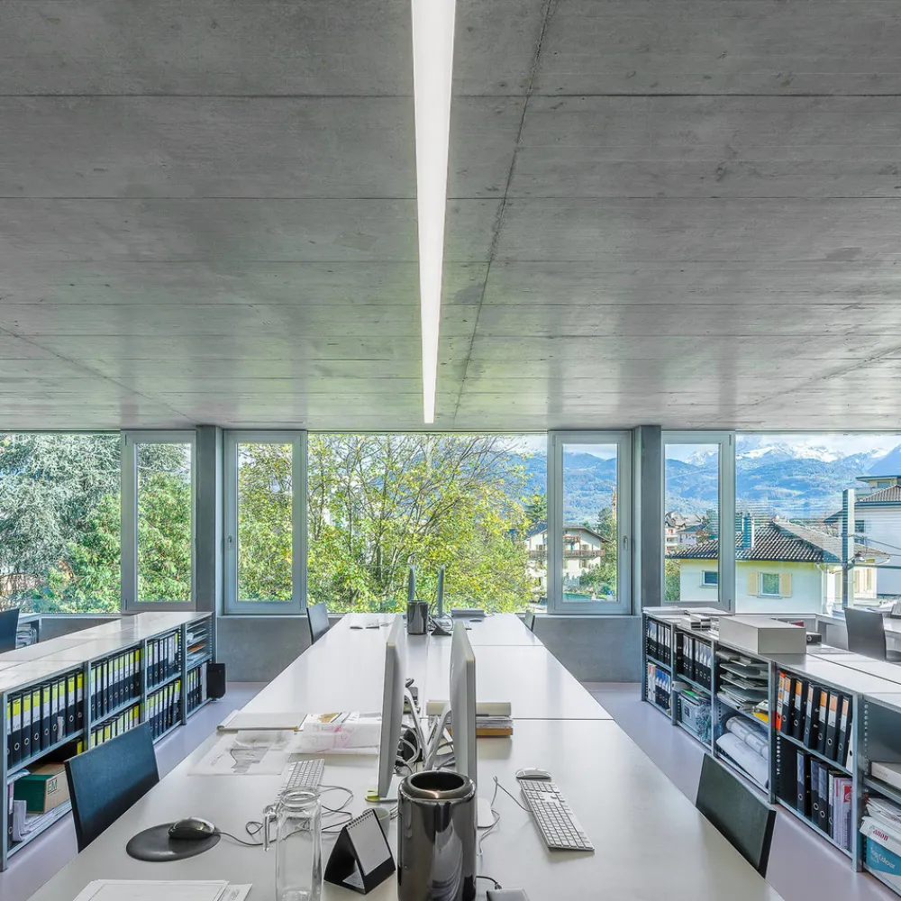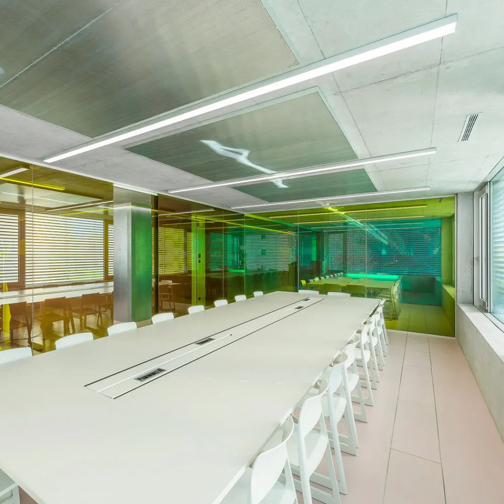 Den utenpåliggende armaturen Purelite Office er en meget effektiv LED-lyslist lysstripe, som er utstyrt med et naturlig anodisert aluminiumshus og en plastdiffusor (mikroprismatisk CLD – kontrollert luminansdiffuser). En sertifisert MINERGIE®-modul fra produsenten Regent er installert. Purelite Office gir effektivt allsidig lys med lav gjenskinneffekt, som også lyser taket. Dette sikrer tilstrekkelig rombelysning med en skyggefri lyslinje. DALI-dimbar kontrollutstyr er inkludert i leveransen av armaturen.