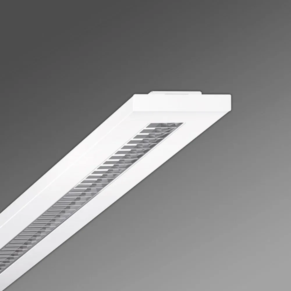 Denne slanke LED-rasterlampe imponerer med sitt minimalistiske eksteriør, som bestemmes av den minimale synlige høyden på 2,6 cm. En silke-matt dobbel parabolsk gitter med lameller med lite tverrsnitt ble integrert i stålplatehuset. Det innfelte, oppoverstående huset skaper en avstand til taket, og lysutgangsåpningene i rammen skaper en estetisk lysura som gjør at lampen virker vektløs.