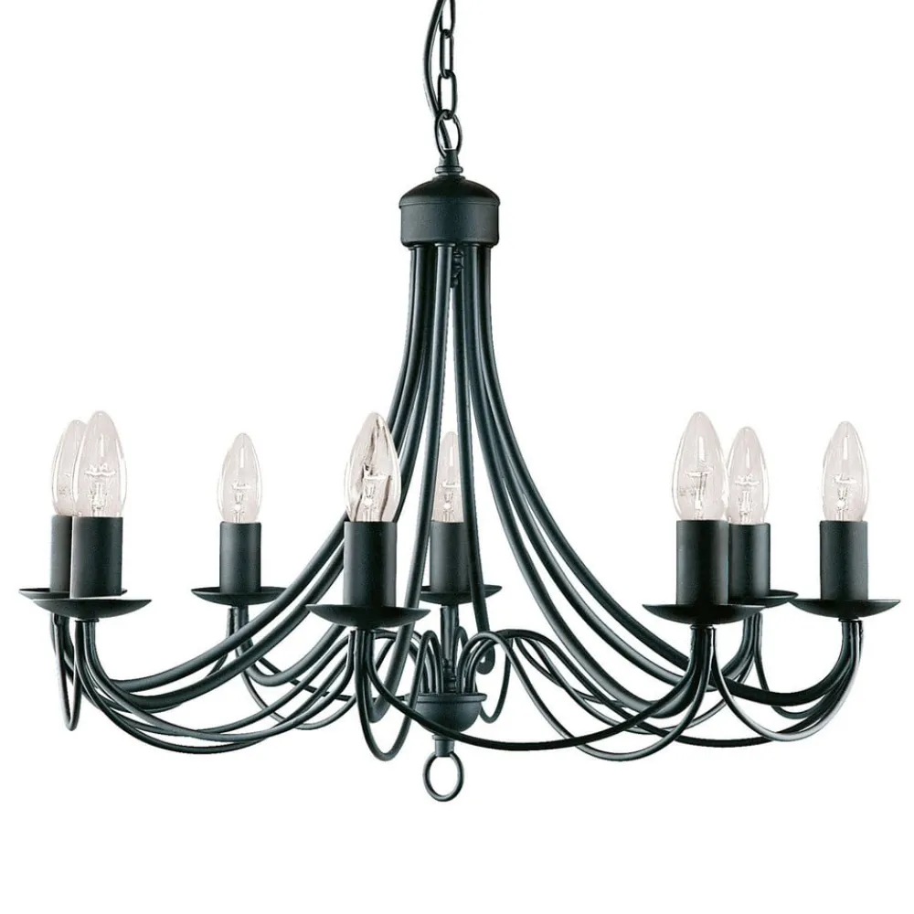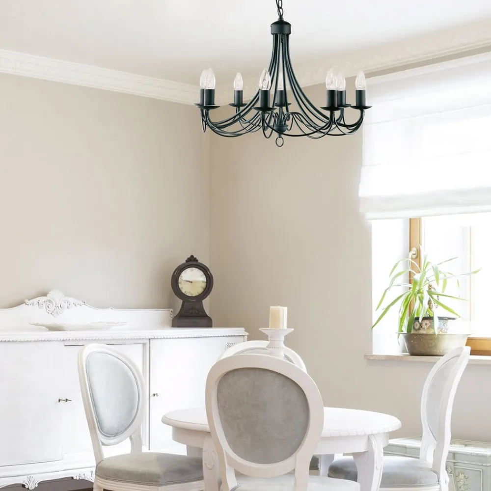 Maypole lysekrone, lakkert i matt svart, er en klassiker som passer for et bredt utvalg av lysoppgaver. Uten dekorasjoner og likevel vakkert buet, imponerer den med sin moderne enkelhet, der den fanger blikket med den matt sorte fargen. lysekrone kan brukes til bordbelysning i spisestuen så vel som til generell belysning av et rom og kan integreres i mange levende stiler. Det er også et veldig godt valg i serveringssektoren.