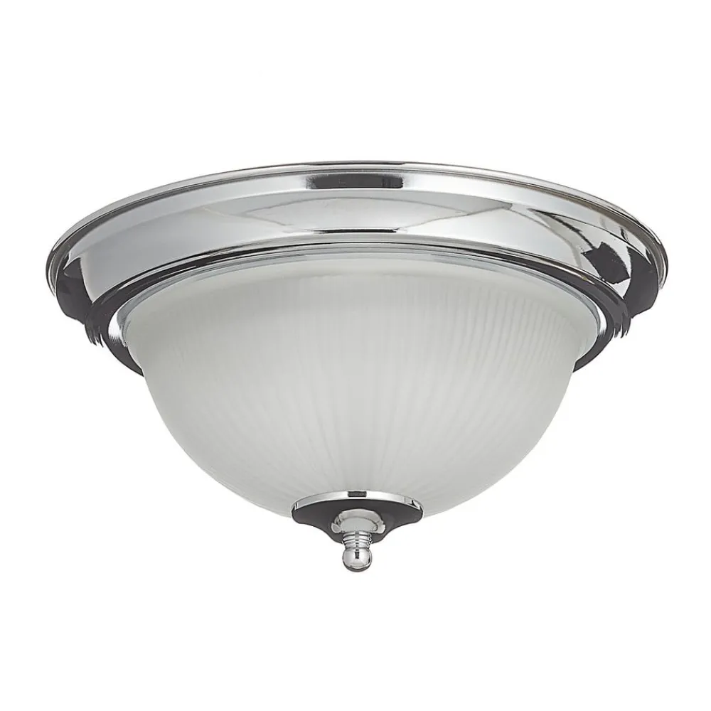 Taklampen American Diner er det perfekte lyset til badet og kjøkkenet, for den har kapslingsgrad IP44 som beskytter lampen mot vann og støv. Lampen ser dessuten utrolig flott ut: det runde veggfestet er i elegant krom, lampeskjermen er i melkehvitt glass med gammeldagse rifler, og under skjermen sitter en liten metallkappe. Denne bidrar til et særpreget utseende og passer perfekt til veggfestet. Inni skjermen er det E14-sokler til to mignonpærer som lyser behagelig når lampen slås på. American Diner er den rette lampen hvis du ønsker belysning i rom der lampen må tåle litt.
