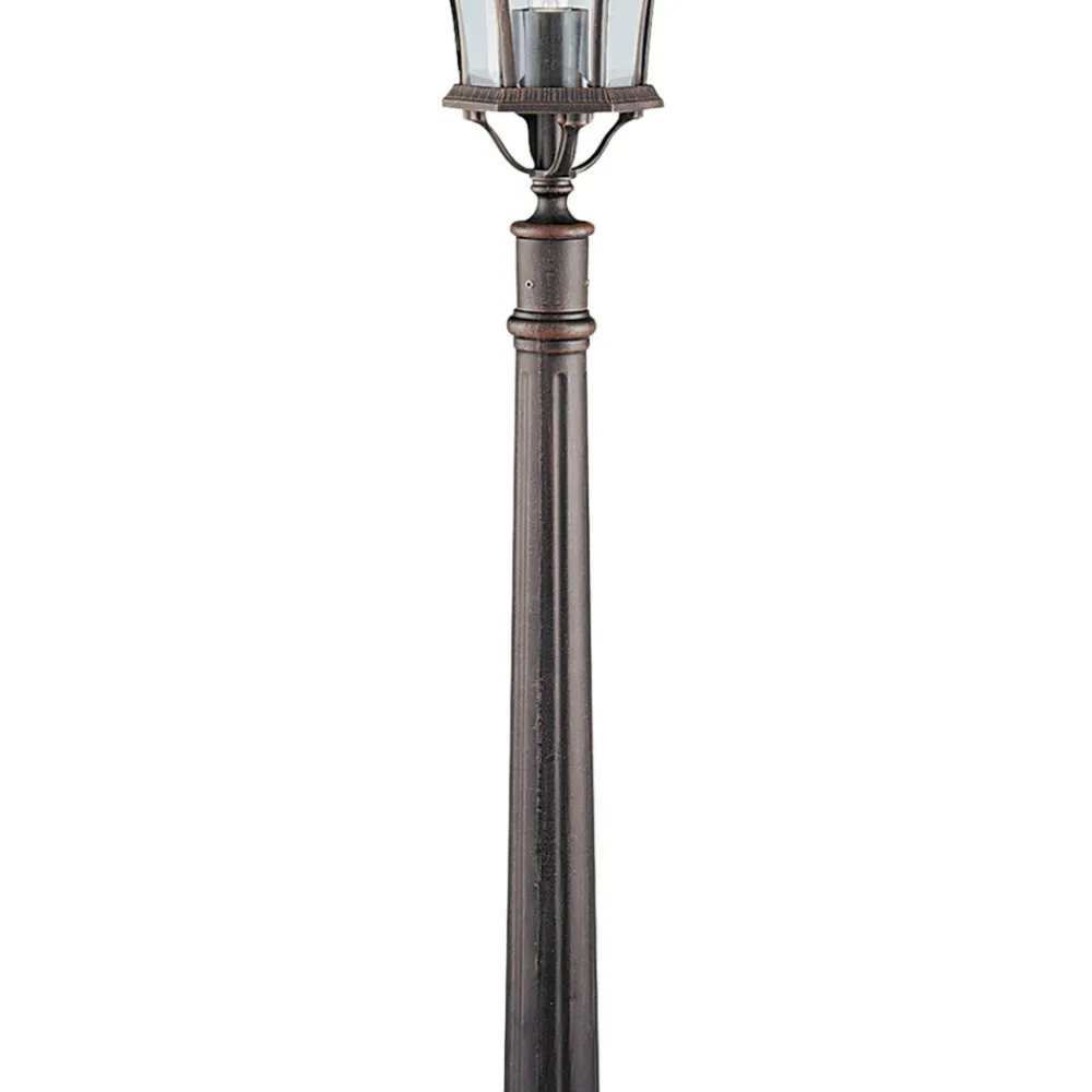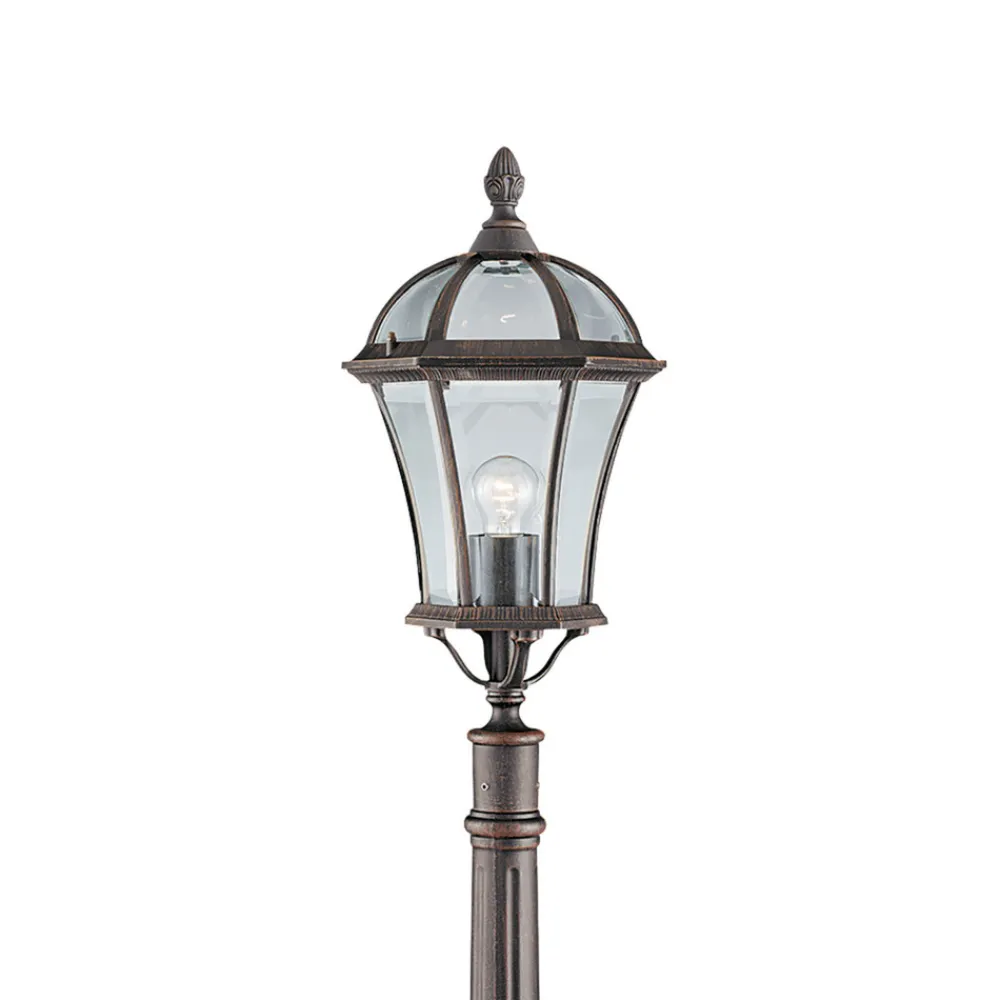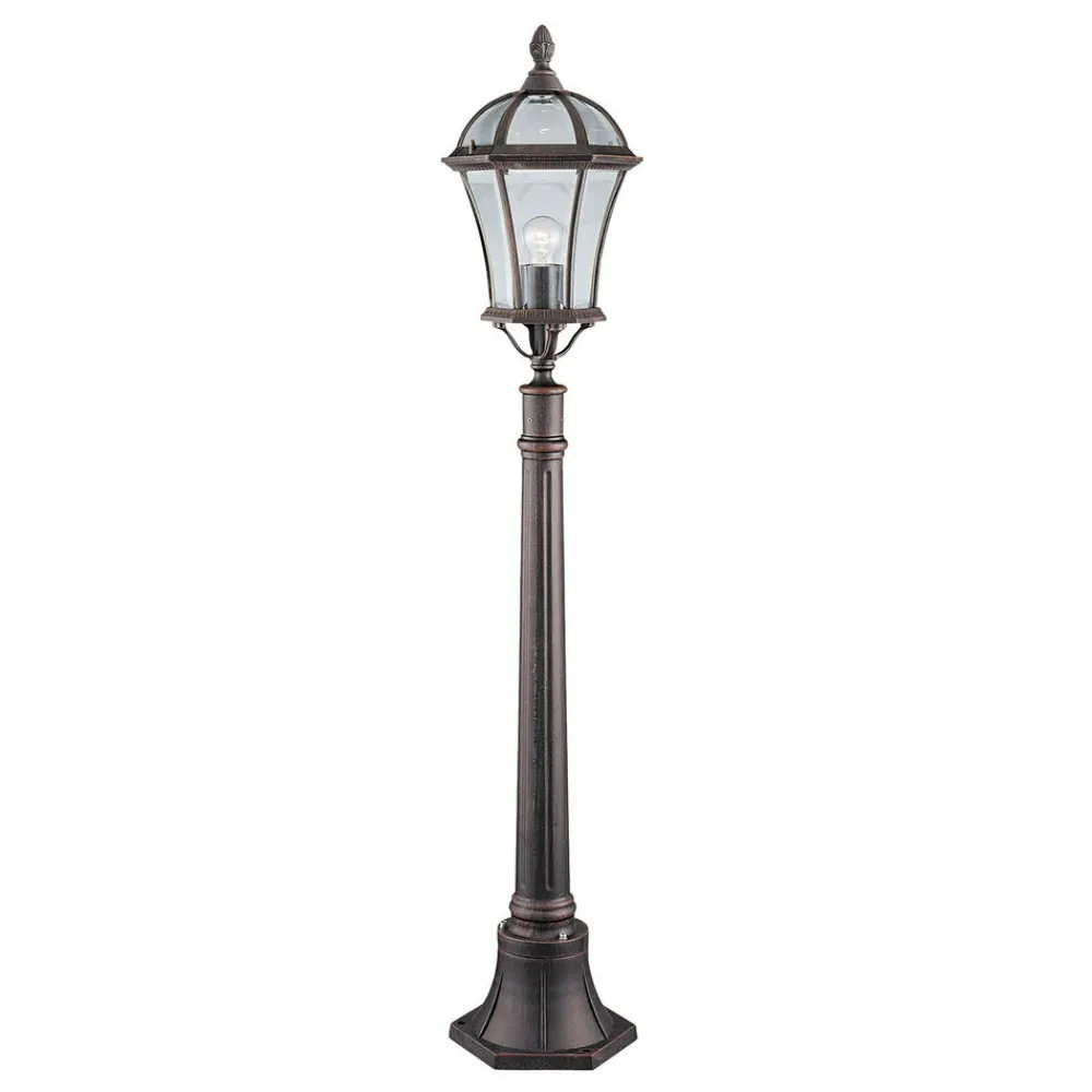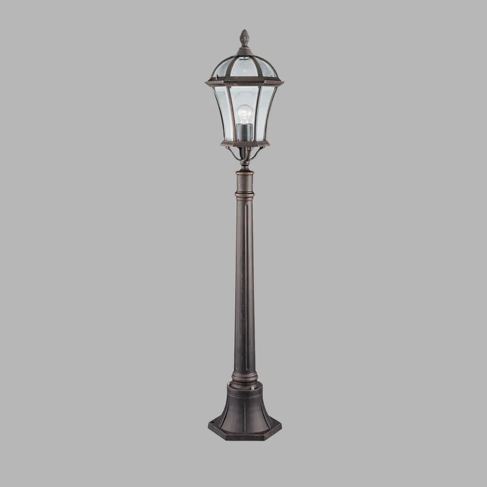 Denne banelyset med en lykt som peker oppover er laget av slitesterk aluminium. Capri-stilyset er malt i rustikk brun og er ideell for utendørsområder i antikk stil. Lyset fra lampen som brukes sendes ut i alle retninger og lyser opp omgivelsene på en svært behagelig måte.