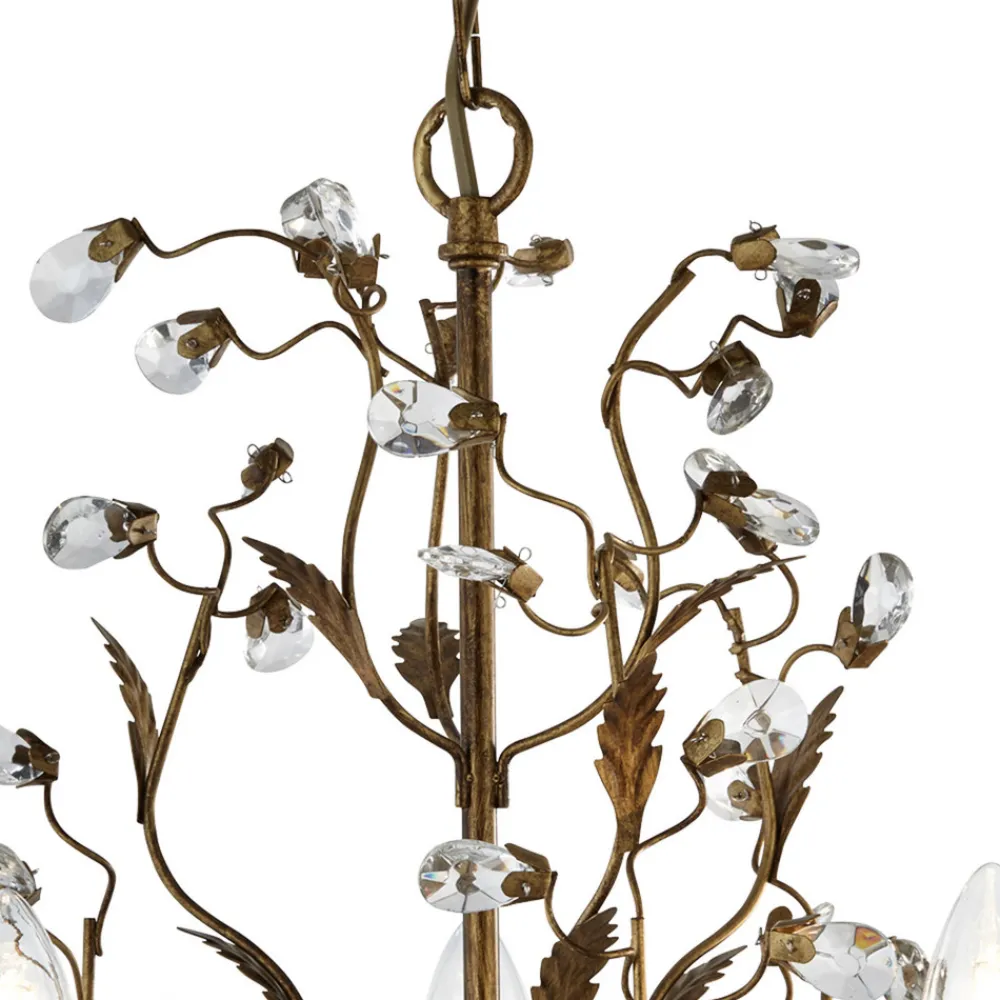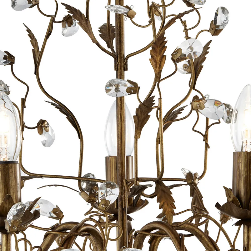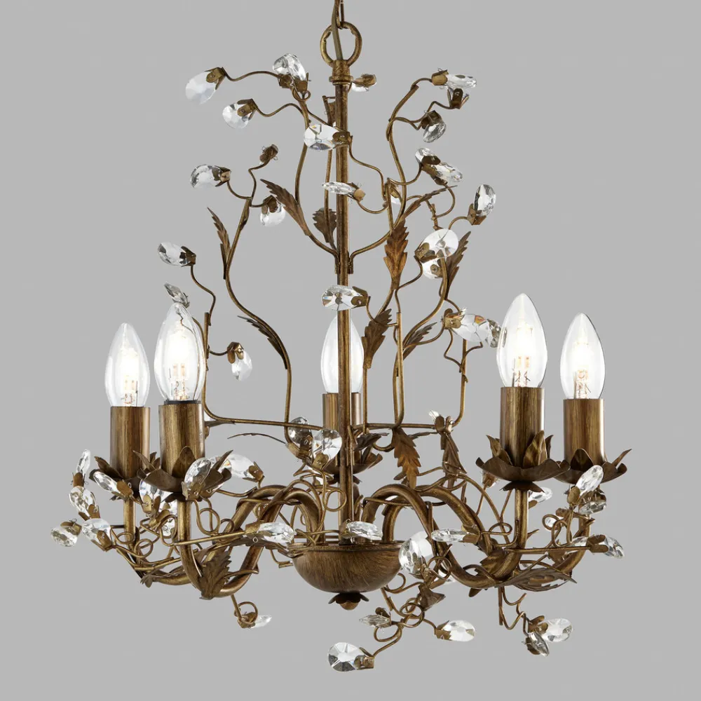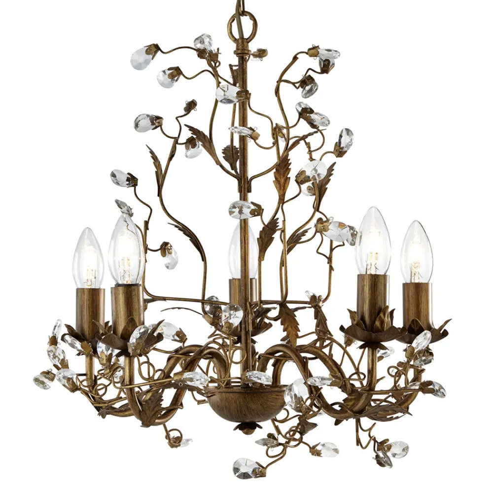 Den pompøse lysekronen ved navn Almanite er utformet i florentinsk stil, det vil si lamper med blomsterpreg. Lysekronen har fine snirklede skudd som minner om slyngplanter. De er pyntet med krystaller som minner om knopper. De fem lampene som er fordelt på lyset ser ut som stearinlys og understreker lysekronens edle og klassiske stil Dette er festet på et kjettingoppheng. Den brun-gylne lakkeringen funkler imponerende når du slår på lampen. Dette praktverket er fremstilt av metall og krystall. Prektig og virkningsfull -det er lysekronen Almandite.