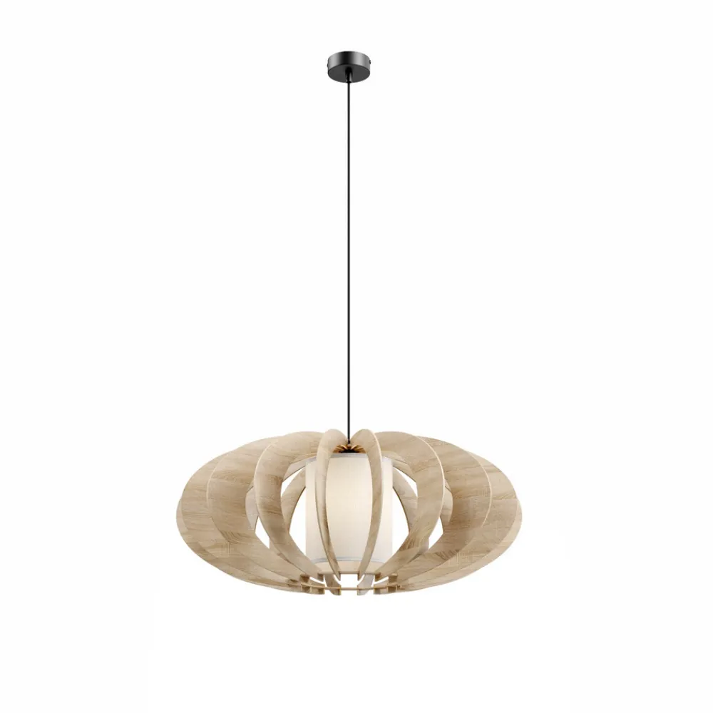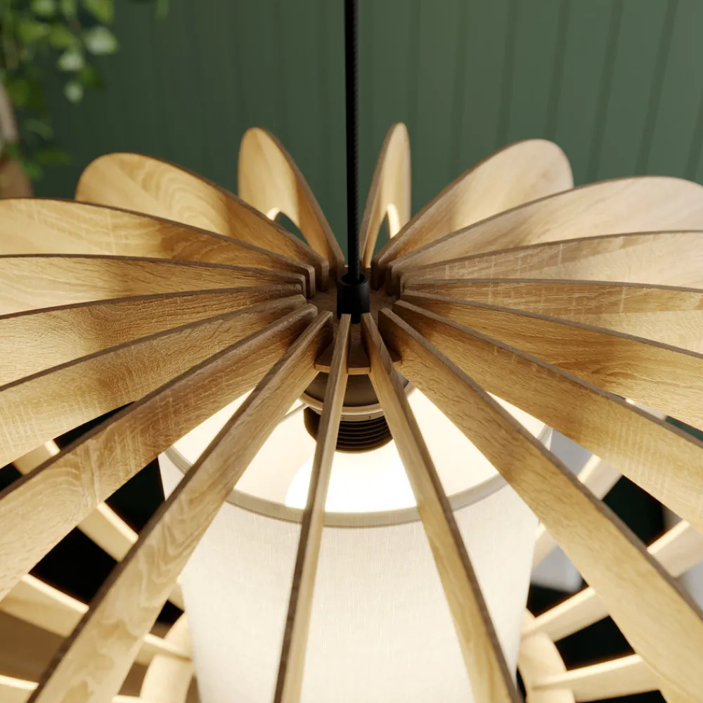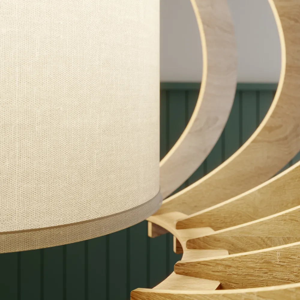 Hengelampen Modern A L kombinerer tidløs eleganse med varmen fra naturlige materialer. Laget av høykvalitets trefiberplate, kombinert med tekstil og pulverlakkert stål, setter denne lampen stilfulle aksenter i ethvert moderne hjem. Den harmoniske fargen i eik, ecru og svart understreker det elegante designet og passer perfekt inn i stuen, kjøkkenet eller spisestuen.