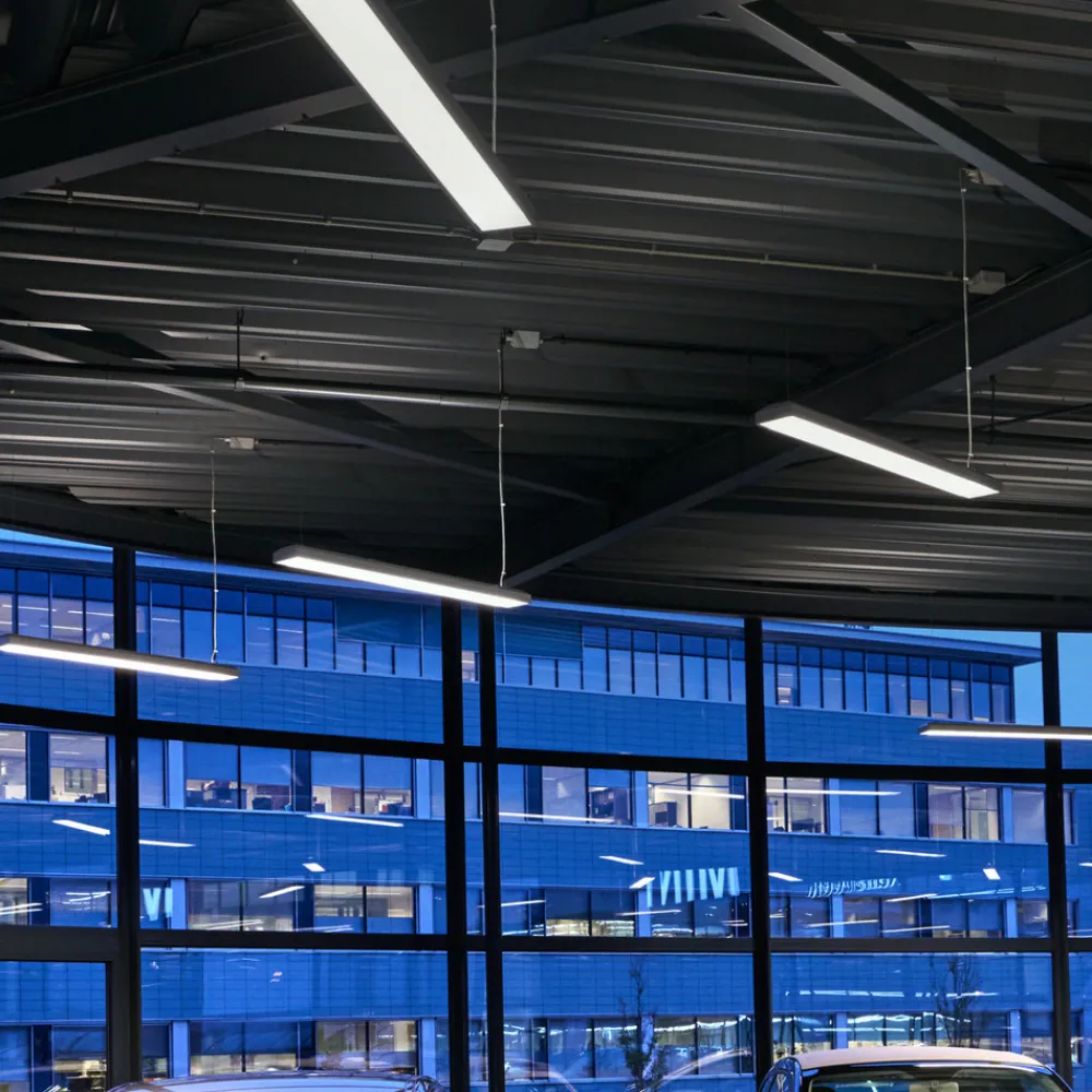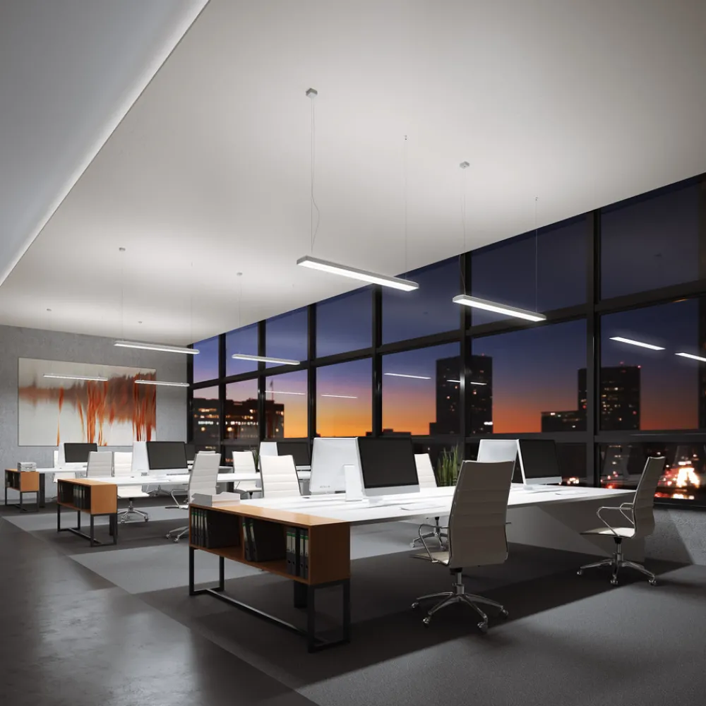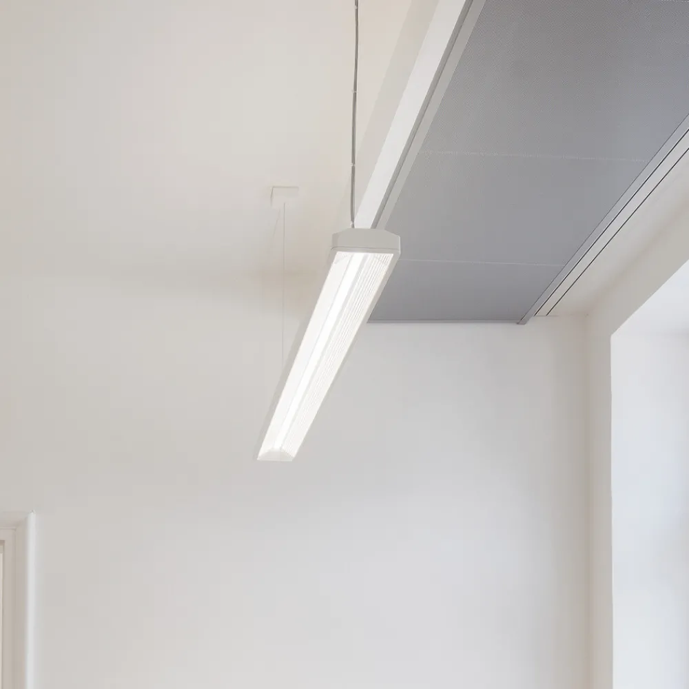 Dimbar Taris LED-pendelarmatur med EVG DALI Takket være primær avblending ved hjelp av et mikroraster oppnår Taris LED-pendelarmatur et blendingsfritt lys med en avblendingsindeks på UGR 19, noe som gjør den perfekt til bruk i kontorer med dataarbeidsstasjoner. Pendelarmaturen er laget av plast, og den primære lysavdekningen består av en aksial linse av PMMA med strukturert overflate. Det hvite universallyset fra LED-lampene sendes symmetrisk både oppover for indirekte, generell rombelysning og nedover for direkte belysning av f.eks. skrivebordet. Dette gir en svært behagelig belysning på kontoret eller i mange andre områder med dataarbeidsplasser. Armaturen er utstyrt med en dimbar forkoblingsenhet og kan også dimmes via DALI (ikke inkludert). Monteringssettet for oppheng av armaturen følger ikke med – må bestilles separat – Tilkobling: 5-polet klemme – med strukturert aksial linse og mikroraster – symmetrisk bredstrålende med UGR 19 i synsretningen langs og på tvers av armaturen – gjennomsnittlig nominell levetid 50 000 h L80B50 ved UT = 25 °C