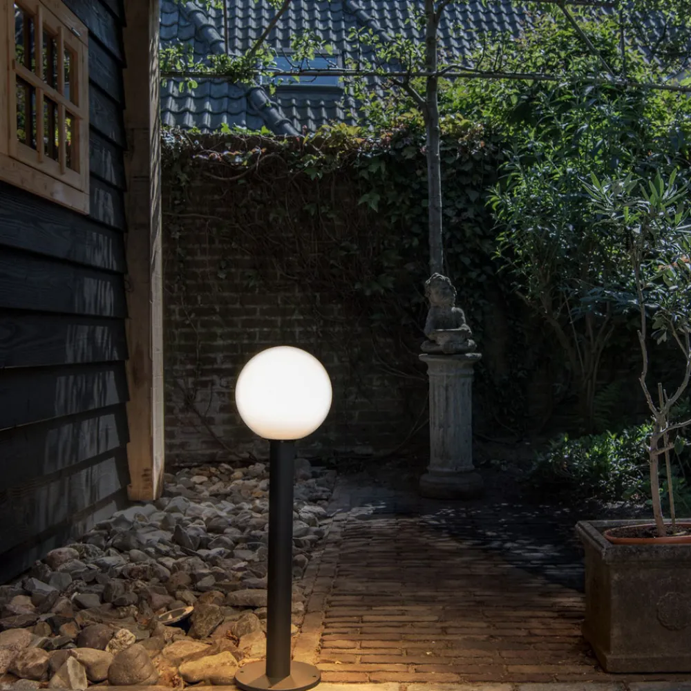 Gloo Pure gangbanebelysning – sikker belysning av alle eiendommens gangveier Eiendomsbelysning er ikke bare dekorativt, men først og fremst viktig for sikkerheten. Stibelysningen Gloo Pure er ideell for markering av stier og andre områder i mørket, med et sfærisk armaturhus i frostet glass som gir god belysning hele veien rundt. Fargen på stibelysningen Gloo Pure med antrasittlakkert aluminiumsramme passer til mange eiendomsdesign.