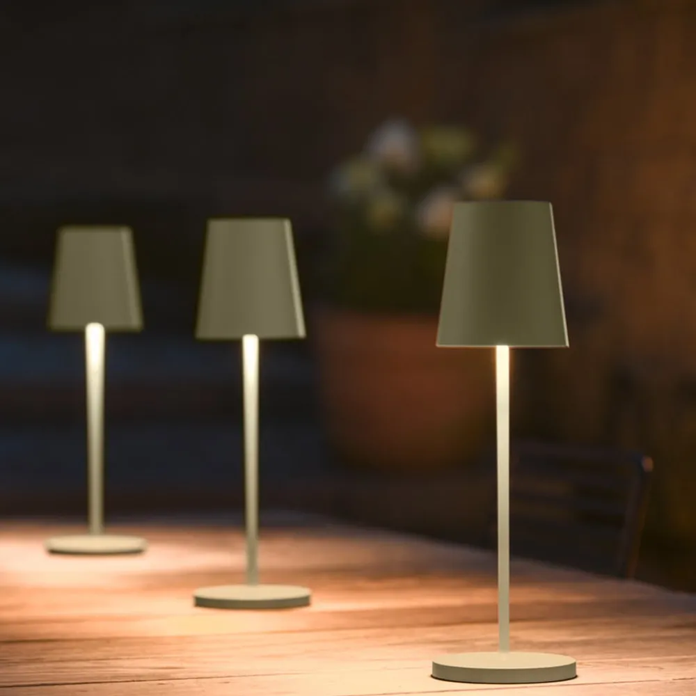 LED-bordlampe Vinolina Two med regulerbar lysfarge (CCT) Vinolina Two er navnet på denne bordlampen i aluminium av høy kvalitet, som også kan tas med ut takket være kapslingsgrad IP65. Den tidløse designen gjør at den kan lyse opp og ned i 10 timer på én lading, og fargetemperaturen kan stilles inn i tre varmhvite nivåer via en CCT-bryter. Ladestasjon og USB-kabel er inkludert i leveransen – Utstyrt med dimmer