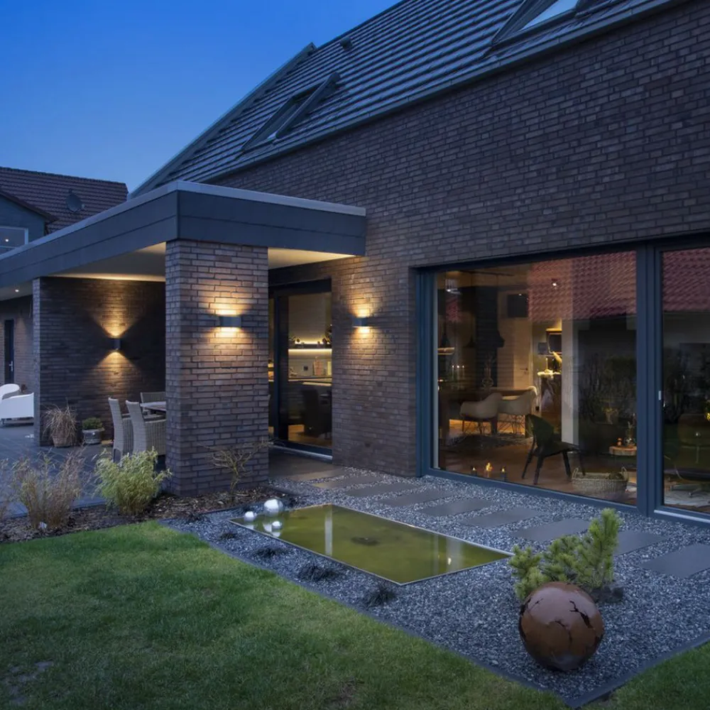 Sitra LED-vegglampe for utendørs bruk scorer med sin design som kan kombineres på mange måter, lys som sendes ut oppover og nedover og variabel fargetemperatur. Det er mulig å justere lysfarge til 3000 K (varmt hvitt lys) eller 4000 K (universell hvitt lys) ved hjelp av den integrerte CCT-bryteren. Kroppen er laget av aluminium og utformet som en kuboid med en monokrom finish.