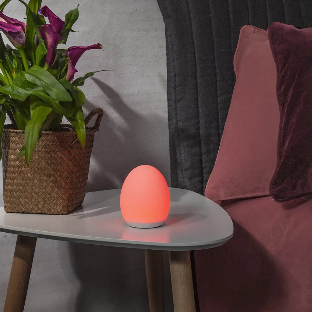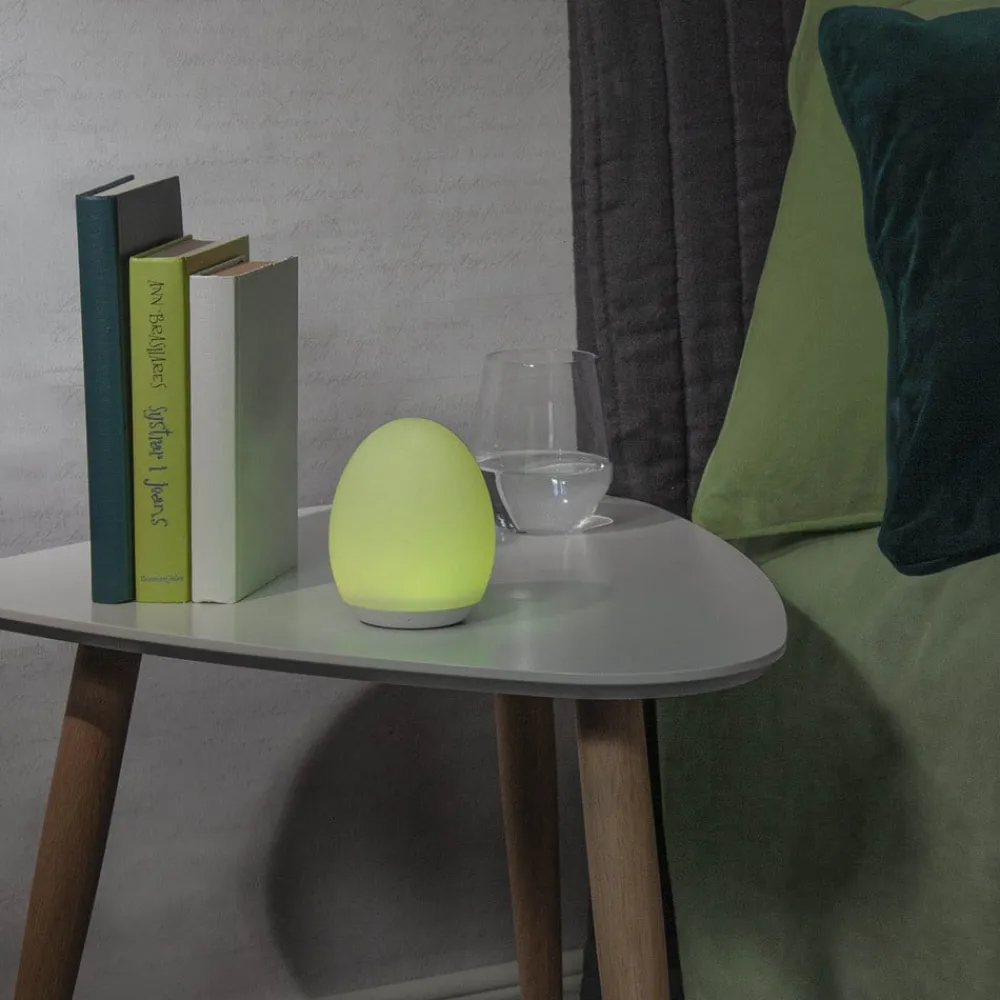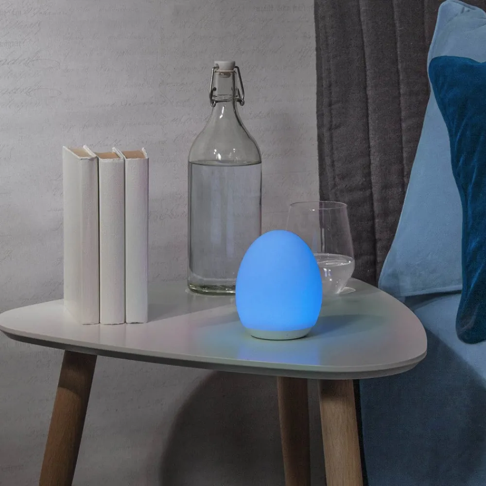 Ikke bare på nattbordet, men også som dekorasjon på bord, vindu og hyller – denne ovale, batteridrevne bordlampen har mange bruksområder, fordi den ikke krever stikkontakt under drift. En integrert batterilader med USB-ladekabel lader opp LED-lysene på ca. tre timer. Du kan bytte og endre lys mellom varmhvitt og åtte fargerike nyanser ved å trykke ned den øvre delen.