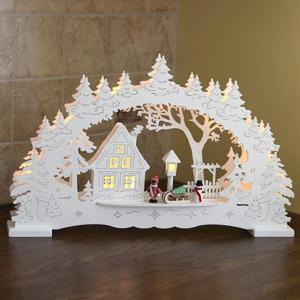 LED-lysbuen Village pynter opp i hyller, på kommoder og på bord i adventstiden, og den passer, med sin koselige vinterlandsby og det vakre lyset, spesielt godt i vinduskarmen. Både vinterskogen, som er formet som en bue, huset og lykten lyses opp av LED-er med et varmhvitt lys. Transformator følger med i leveransen. Også med batterier til drift. Inkl. strømledning (5 m).