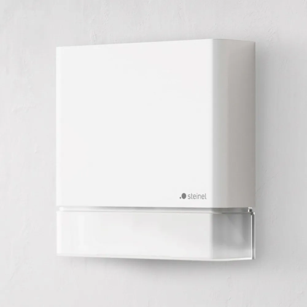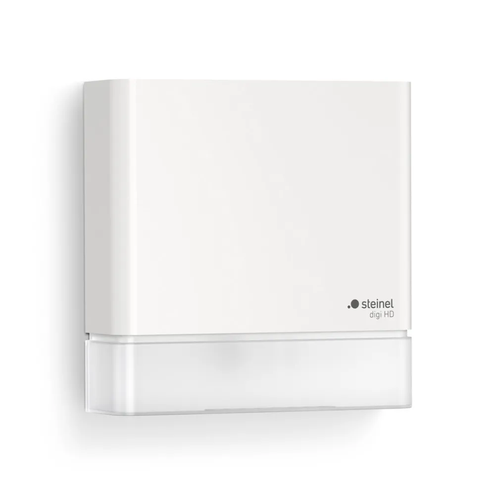IS 180 digi bevegelsesdetektor imponerer med sin subtile fargedesign og flate design, noe som betyr at den lett kan finne veien inn i forskjellige miljøer. Den er utstyrt med beskyttelsesklasse IP54 og kan derfor brukes både innendørs og utendørs. Den infrarøde sensoren oppdager termisk stråling fra bevegelige kropper (f.eks. mennesker eller dyr) i en vinkel på 180° og en radius på 8 meter. Denne strålingen konverteres elektronisk og slår automatisk på en tilkoblet lampe. STEINEL Connect-appen er nødvendig for den digitale konfigurasjonen av sensoren.