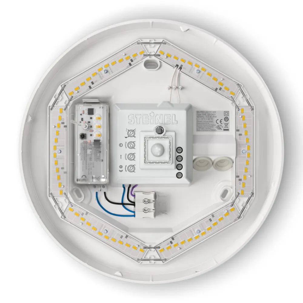 RS Pro P2 S LED-taklampe med sensor og nødlysfunksjon Denne klassiske LED-taklampen fra Steinel med sin attraktive form og høye effektivitet er den perfekte sensorlampen for korridorer eller trappeoppganger. Den kan kobles sammen med opptil 9 andre lamper via kabel. Tidløs design og enkel installasjon kombineres med banebrytende teknologi og maksimal effektivitet. Armaturen er utstyrt med nødlys i henhold til DIN EN 60598-2-22, som gir lys i 3 timer ved strømbrudd – med høyfrekvent bevegelsesdetektor med en deteksjonsvinkel på 360° – skumringsinnstilling 2 – 2000 lux – justerbar lysvarighet fra 5 sekunder til 15 minutter – med omgivelseslysfunksjon – justerbar 10 minutter/30 minutter eller hele natten – egnet for omgivelsestemperaturer fra -10 til 30 °C – maksimal monteringshøyde 4 meter
