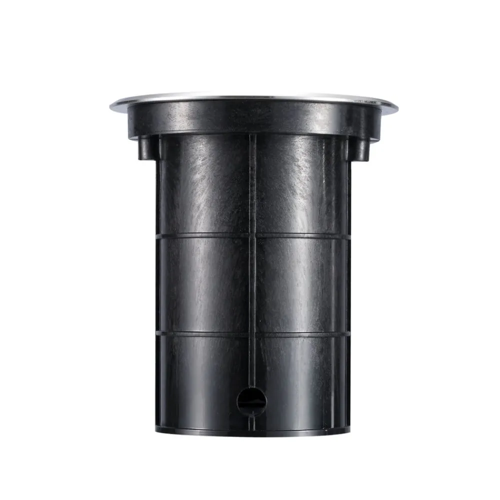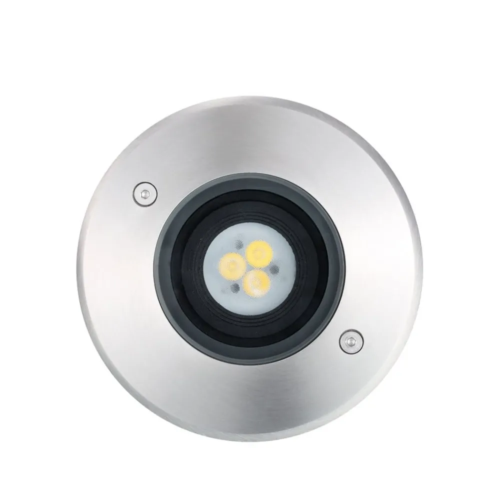 Drive-over LED-bakkespot Interrata Den runde LED-bakkespotten Interrata med en +/-30° justerbar lysmodul kan kjøres over for trykkbelastninger opp til 2000 kg (20 kN) og er utstyrt med 2 m 3×1 mm2 flygeledning og installasjonsrør, aluminiumshus med trimring i rustfritt stål (SS316) og klar glassskjerm – ikke dimbar