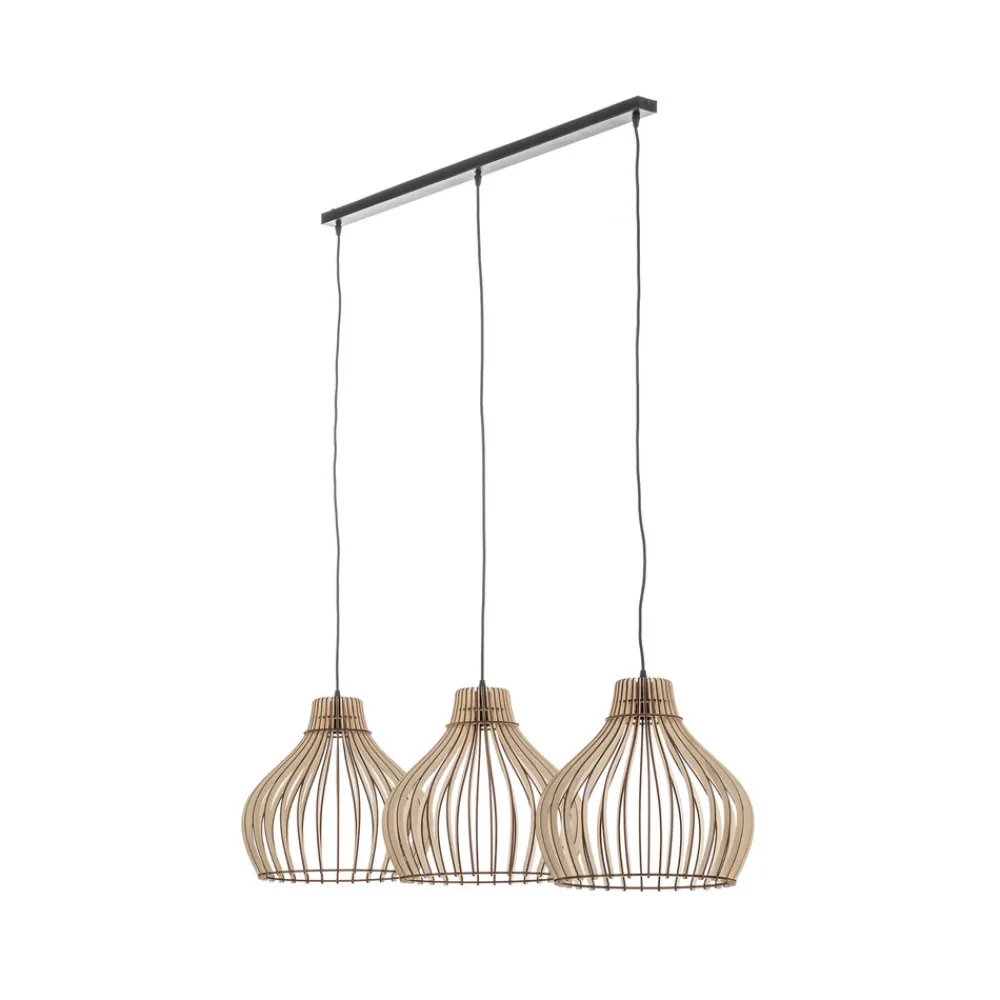 Hengelampen Barrel kombinerer rustikk landlig stil med moderne funksjonalitet. Denne lampen er laget av høykvalitets stål og tre og gir naturlig sjarm til oppholdsrom som stue, kjøkken eller spisestue. De tre trelampeskjermene i lyst tre og svart finish gir hvert rom en varm og innbydende atmosfære. Et spesielt høydepunkt er muligheten til å tilpasse lampen individuelt med en ekstern dimmer for å skape ønsket lysstemning.