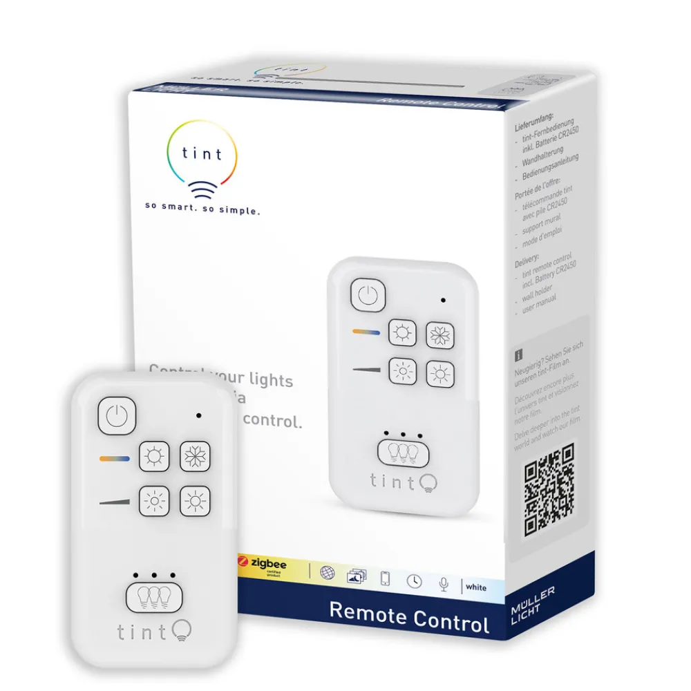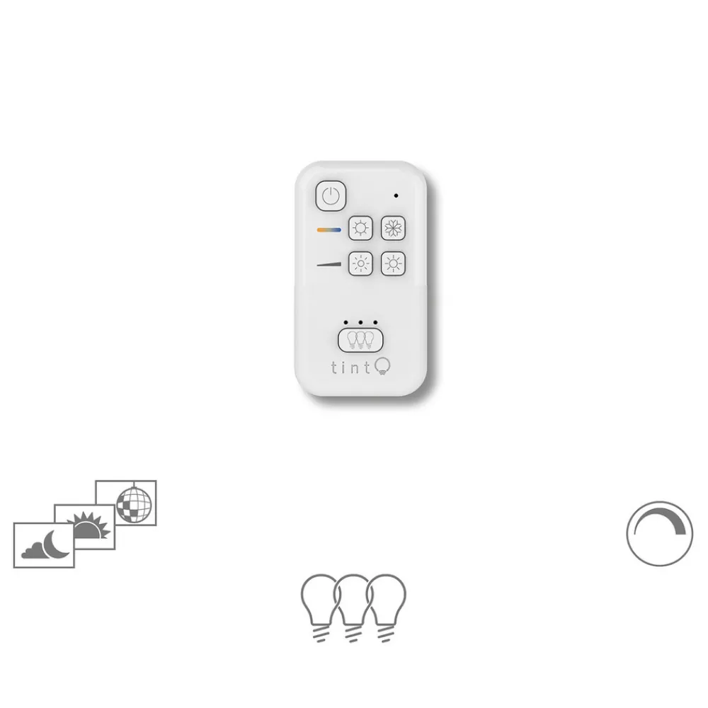 Müller Licht tint fjernkontroll – perfekt for styring av tint «white»-produkter Den lille, kompakte fjernkontrollen fra tint-serien kan brukes til å styre alle egnede lyskilder og lamper med hvit lysstyring, dvs. såkalte tint «white»-produkter. Enten du vil justere hvitfargen fra varm til kald, dempe lyset eller til og med gruppere flere lamper, er alt dette mulig med den lille fjernkontrollen i tillegg til klassisk av- og påkobling. De mange valgmulighetene er svært praktiske og gjør betjeningen av smart tint-lampene både enkel og intuitiv. tint-fjernkontrollen leveres med et praktisk veggfeste som er magnetisk og kan festes nesten hvor som helst. Dermed er den lille kontrollenheten alltid tilgjengelig og kan til og med brukes som veggbryter.