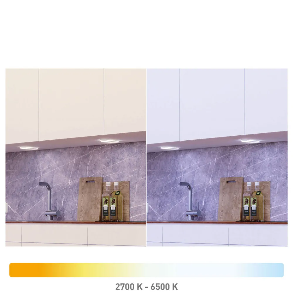 tint LED-benkbelysning Armaro i sett med 3 – smart kontrollerbar med fjernkontroll, app eller stemmeassistent Smart kontrollerbart lys til kjøkkenet? Ikke noe problem med det praktiske Armaro-settet med 3 stk. fra tint-serien. De små LED-benkbelysningene er utstyrt med smart kontrollerbar LED-belysning og gir Leuchten Direkt nedover samt et lite indirekte lys, som genereres helt i kanten av lyset. De tre LED-belysningene monteres under møbler, for eksempel under overskapet på kjøkkenet. De gir ikke bare lys, men også høy komfort og moderne funksjonalitet. Lampene er utstyrt med en berøringsknapp som gjør det enkelt å slå dem av og på etter montering. Det er enkelt å dimme eller koble dem sammen med andre lamper ved hjelp av en egnet fjernkontroll eller din egen smarttelefon. Amaro underskapslampesett kan integreres i et egnet smarthussystem takket være moderne ZigBee-teknologi. Når det er integrert, kan det styres via en app eller stemmekommando. Funksjoner/kompatibilitet: – kan styres via en egnet fjernkontroll i tint (se tilbehør) – kan styres via app basert på ZigBee radiostandard 3.0 – kompatibel med stemmeassistenten Alexa (Amazon) – kan integreres i ZigBee-baserte smarthussystemer, for eksempel med Philips Hue, OSRAM Lightify etc. – varmhvitt lys (2 700 K) til dagslys (6 500 K) – dimbar