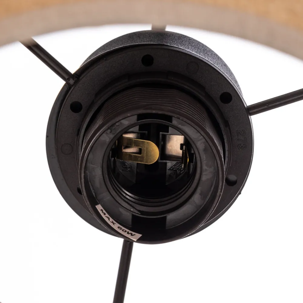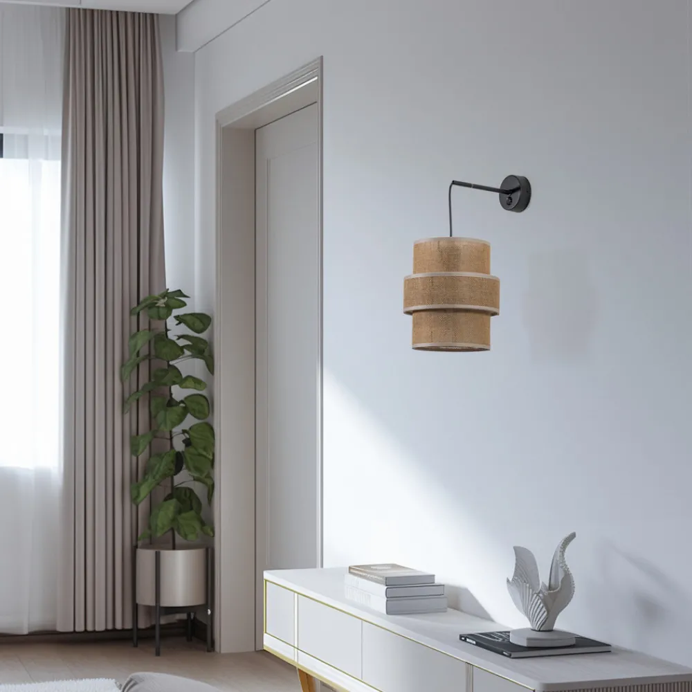 Calisto vegglampe med sylindrisk skjerm av naturlig brun jute Calisto vegglampe har en sylindrisk skjerm som består av to kuler med ulik diameter. Tekstilet i jute gir vegglampen et koselig og naturlig preg. Det er en bryter på det svarte veggfestet for betjening.