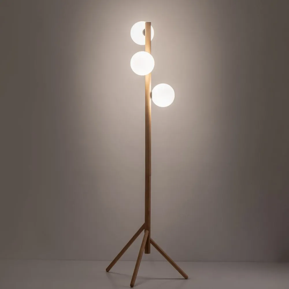 Estera gulvlampe med treramme og tre sfæriske opalglassskjermer Med sine tre sfæriske opalglassskjermer, hver med fatning G9, gir Estera gulvlampe behagelig belysning på alle sider. Stativet med tre ben er laget av lyst treverk.