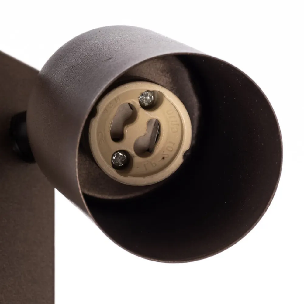 Justerbar Top veggspot med sylindrisk hode og bryter GU10 Top veggspot i stål med matt, mørkebrun finish består av et rektangulært veggfeste og et sylindrisk spothode. Sistnevnte er justerbart slik at lyset kan rettes mot ønsket område. Utstyrt med en bryter på veggfesten.