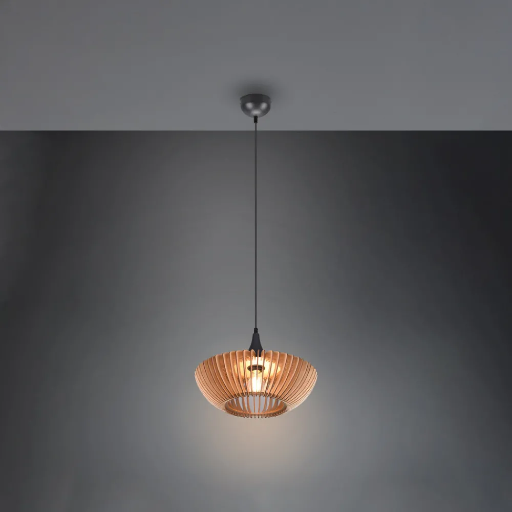 Sjarmerende Colino pendellampe med treskjermDenne pendellampen har en grasiøst buet treskjerm som er satt sammen av en rekke trelameller. Lyset fra den innsatte lampen avgir til alle sider og gir stue og spisestue en koselig grunn- eller områdebelysning.