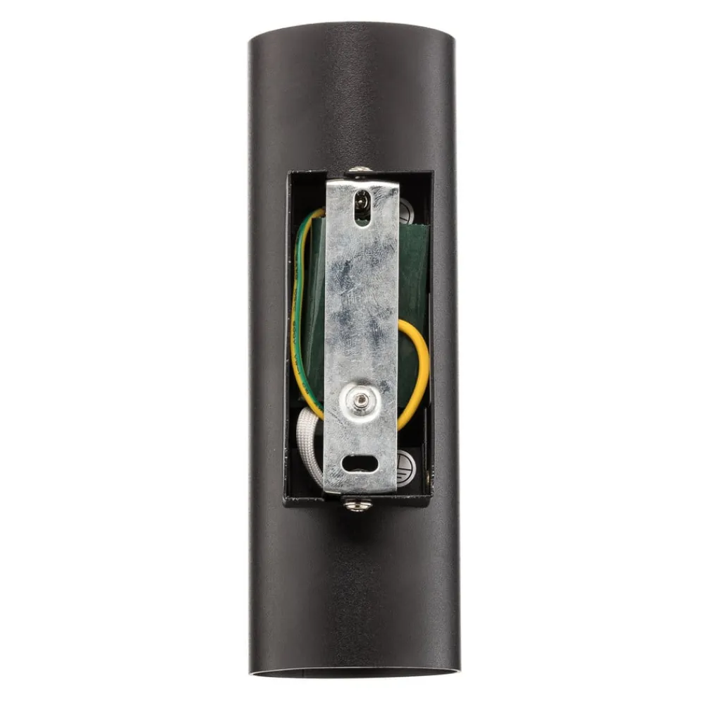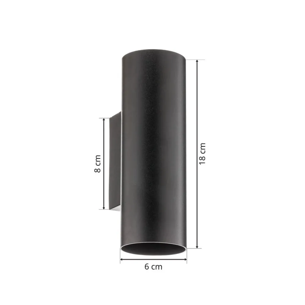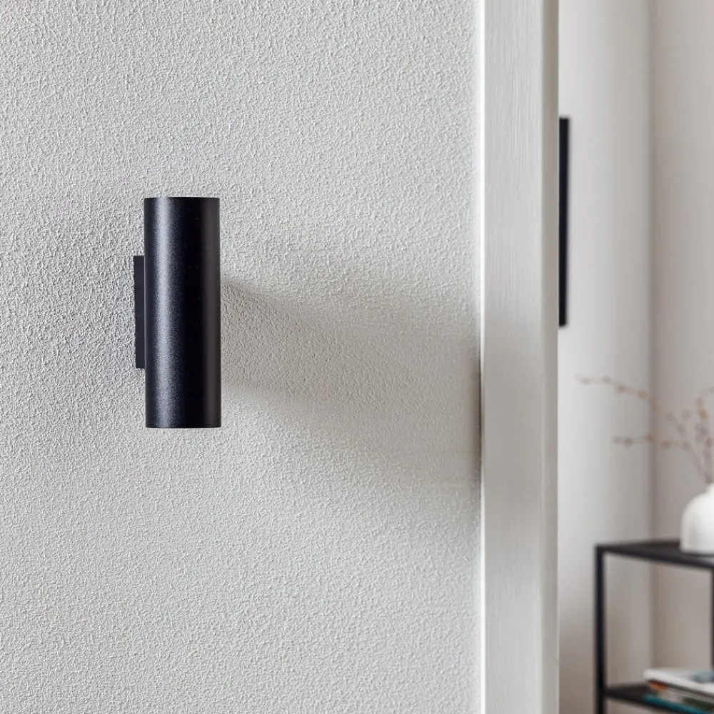 Matsvart Marley vegglampe, lysutslipp på to sider Laget av metall i sylindrisk form og utstyrt med lysuttak øverst og nederst, er den svarte Marley vegglampen en effektiv ekstra lyskilde på veggen. Flere vegglamper på en vegg ser spesielt attraktive ut i lange korridorer eller i stuen. Takket være den moderne og enkle designen er den ideell til bruk i rom med moderne design. Leveres uten pære.