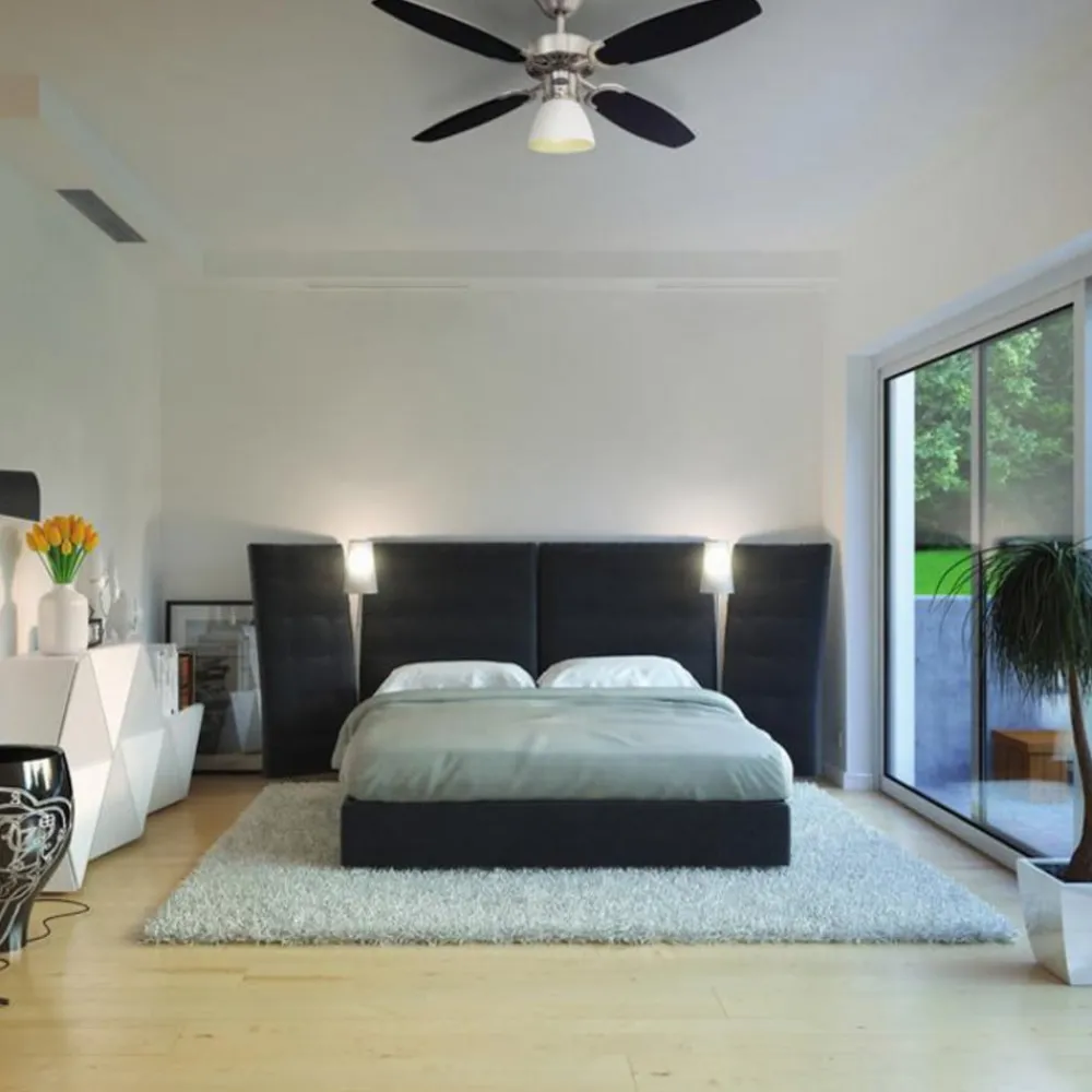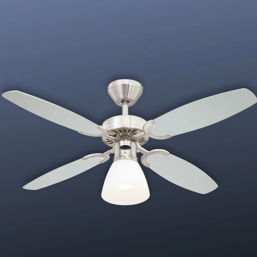 Ventilatoren Capitol med fire rotorer i flott design: Hus og motor er i børstet stål, rotorbladene kan vendes om og er svart på den ene siden og sølvfarget på den andre siden. Dermed kan de tilpasses personlig smak og innredningsstil. Med en diameter på 105 cm passer denne eksklusive ventilatoren i rom på inntil 15 m². Både sommer- og vinterdrift er mulig. Det betyr at rotorbladene går mot venstre i sommerdrift og sirkulerer luften slik at rommet kjøles ned. Høyrekjøringen om vinteren gjør at den varme fyringsluften som samles under taket omfordeles. Slik kan du spare energi (ca. 30 prosent) og redusere fyringskostnadene. Capitol har en trekkbryter og kan oppgraderes med en fjernkontroll eller veggbryter . Den formfine glasskjermen gir behagelig omgivelsesbelysning.