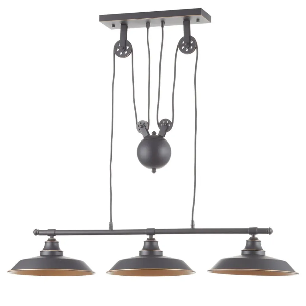 Iron Hill består av tre lampeskjermer som takket være den brede åpningen gir et klart syn på lyskilden. For å fullføre den industrielle designen perfekt, ble matchende glødelamper med vintage-utseende lagret i tilbehøret. Lampeskjermene er festet til et trekksystem. Dette betyr at armaturopphenget kan skreddersys etter personlige behov.