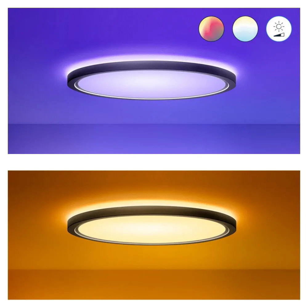 Smart SuperSlim LED-takarmatur i rund form, RGB og CCTTDen ekstra flate SuperSlim LED-takarmaturen gir ikke bare omfattende, direkte allmennbelysning, men også attraktiv takbelysning. Den overbeviser også med variable lysalternativer, slik at du alltid har det perfekte lyset tilgjengelig. I tillegg til lysstyrken kan også lysfargen justeres – med varmhvitt til dagslyshvitt lys og fargeskalaer er SuperSlim ekstremt variabel. Takket være den innebygde WiZ-teknologien kan LED-taklampen kobles til smarttelefonen/nettbrettet via WLAN og styres med den tilhørende WiZ-appen. I tillegg er det også mulig å bruke WiZ-veggbryteren eller WiZ-fjernkontrollen (se tilbehør).tekniske data / kompatibilitet:- kan integreres via WLAN; bro eller gateway er ikke nødvendig- kan styres med smarttelefonen eller nettbrettet med WiZ-appen for iOS (fra versjon 11.0) og Android (fra versjon 4.4) på stedet eller på farten (krever internettforbindelse)- over 64 000 hvite toner kan stilles inn (Tunable White), 16 millioner fargenyanser- kan dimmes eller slås av (se tilbehør). appfunksjoner: direkte kobling og dimming, lagring av populære scener via kamerabilder, tilordning av armaturer til rom/grupper, oppretting av tidsplaner, valg av forhåndsinnstilte lysmoduser/scener, tilordning av flere brukere og tildeling av tilgangsrettigheter, betjening av opptil 10.000 WiZ-lamper- kan styres med WiZ-fjernkontroll (se tilbehør)- to favorittfunksjoner kan tilordnes den konvensjonelle bryteren via app (WiZclick)- stemmestyring når den er integrert i Google Home, Amazon Alexa (Amazon web services abonnerer i lampens levetid) eller Apple HomeKit- integrering i IFTTT for kobling med flere smarte enheter